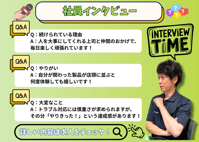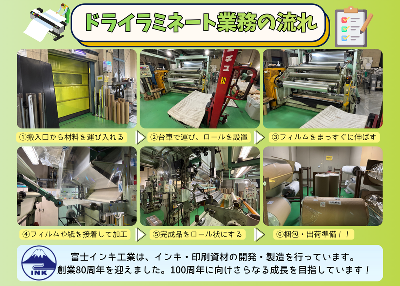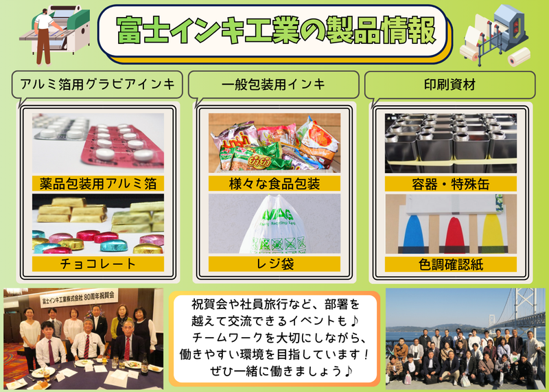 仕事内容 \\若手スタッフ活躍中★未経験歓迎// ✨ドライラミネート加工スタッフ募集✨ ✅未経験から手に職をつけたい ✅機械いじりが好き ✅人とコミュニケーションをとることが好き ✅コツコツ作業が好き そんな方にぴったりのお仕事です! ⏰仕事内容 ▼ドライラミネート作業とは? フィルムや紙、アルミ箔などの基材を貼り合わせて、製品を作るお仕事です。 ▼主な製造品 お菓子や惣菜の袋、建材の壁紙など、日常で使われるさまざまな製品を手掛けています。 ▼具体的な業務内容 ・ロール搬入:搬入口から材料を運び入れる ・機械へセット:台車で運び、ロールを機械に設置 ・フィルムを展開:フィルムをまっすぐに伸ばして準備 ・接着・貼り合わせ:フィルム同士、または紙・アルミを接着剤で貼り合わせ ・巻き取り作業:仕上がった製品をロール状に巻き取る ・梱包・出荷準備:製品を丁寧に梱包し、出荷準備完了! その他、機械のメンテナンス など ※20~50kgの重量物を扱う場面もありますが、 接着剤の計量や運搬は、タイヤ付きの台やリフトを使えるので安心です♪ (リフトは免許がなくてもOK!) 作業は、30~50代の男性スタッフ3名でチームを組んで行っています。 1チームで協力しながら、作業を進めます✨ ≪入社後の流れ≫ ・OJT研修:入社後半年を目安に実施 ・資格取得支援:危険物取扱者資格を会社負担で取得可能(同じ資格であれば2回まで挑戦可能) ・勉強会:月1回の社内・ウェブ勉強会あり。必要に応じて研修も実施 ⏰当社で働く魅力! ✨少人数部署で声が通りやすく、困った時はすぐに助け合える雰囲気◎ ✨機械作業が多いので、機械いじりが好きな方にもピッタリ! ✨夜勤なし&残業があっても1日1時間ほどなので夜もゆっくり過ごせます♪ ✨体験入社可能!希望があれば、面接後の入社前に業務体験ができます◎ ✨賞与年2回(7月・12月)!昨年は年間で2.5ヶ月分支給されました♪ ✨ネットフリックス手当など手当&福利厚生も充実! ✨宅配弁当や食事補助(350円~500円)など、食事サポートあり! ✨休憩も快適!休憩室には冷蔵庫・電子レンジも完備♪ ✨夏には、冷却ベストやスポーツドリンク支給で暑さ対策もバッチリ! ⏰社員インタビュー【入社20年/Gさん】 Q:入社のきっかけを教えてください A:工業高校を卒業後、車のナンバープレートを作る会社に入社しましたが、社内の雰囲気が窮屈に感じていました。「トラックに関わる仕事がしたい!」と思いつも定職につかず迷っていたところ、ハローワークで当社の求人を発見。 元々ものづくりが好きだったので、ドライラミネート加工の仕事にも興味が湧き入社を決めました! Q:続けられている理由を教えてください A:運悪く怪我をして辞めようかと思ったとき、本社(兵庫県)の上司の方々がすぐに福岡へ来てくださり、励ましの言葉や悩みを真剣に聞いてくれました。 その行動が大変嬉しく、この人たちについていきたい!恩返しをしたい!と心から思いました。 大変なこともありますが、人を大事にしてくれる上司やチームの仲間と協力しながら、楽しく働けていることが頑張れる理由です! Q:やりがいを教えてください A:自分が関わった製品が店頭に並んでいるのを見ると、とてもやりがいを感じます。 商品本体ではなくそのパッケージなどを作っているため、縁の下の力持ち的な役割ですが、「自分の仕事が世の中に出ている」と実感できる瞬間が嬉しいです。 特にアルミの広幅加工は難しいですが、完成したときの喜びは格別!需要も高く、やりがいのある仕事です! Q:逆に大変なことを教えてください A:トラブル対応には慎重さが求められます。 納期もあるため、自分で考えて対応する場面もありますが、その分「やりきった!」という達成感や成長を感じられる仕事です! Q:求職者に一言お願いします! A:私たちは現在3名のチームで協力しながら働いています! 2025年11月には創業80周年の記念式典や社員旅行があったりと、仕事だけでなくみんなで盛り上がれるイベントもありました! 新しい仲間が加わることを、メンバー全員楽しみにしています! ⏰富士インキ工業とは? 富士インキ工業株式会社は、インキ製品・印刷資材を中心に開発・製造を行っています! 品質や環境にこだわり続け、おかげさまで創業80周年を迎えました。 100周年に向け、さらなる成長を目指しています! 今回は、ドライラミネートの加工スタッフ(機械オペレーター)としてご活躍いただける方を募集中! わからないことはすぐに聞けるので、未経験の方でも安心してスタートできる環境です! ぜひ気軽にご応募ください♪