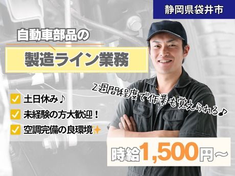 仕事内容 【仕事内容】 《アピールポイント》 ・昇給制度あり(時給+100円、年収約20万円UP) ・空調完備の良環境 ・未経験歓迎 ・正社員登用実績あり ・日払い(前借り)可能! 《電話応募》 053-489-6001までお問い合わせください。 《お仕事データ》 仕事の難易度:★★☆☆☆ 残業の多さ:★☆☆☆☆ 職場環境:★★★☆☆ 昇給しやすさ:★★★★★ - 大手自動車メーカーと直接取引している上場企業です。 自動車に使用されるシャフト(足回り部品)の製造ライン業務をお願いします。 1.部品セット 2.機械組付け・加工 3.検査 未経験でも2週間程で作業を覚えられます。 まずはお気軽にお問い合わせください。 - 【月収例】26万4,500円+交通費規定支給 (時給1,500円、21日勤務、残業10時間、深夜割増20時間分の場合) ・空調完備 ・社員食堂利用可能 ・社会保険即日加入OK ・フルタイム勤務 ・昇給制度あり ・退職金制度あり ・日払い相談可能