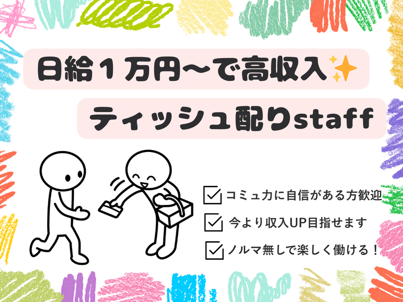 仕事内容 ■■■■■■■■■■■■■■■■■■ 最初は配るだけ。 気づいたら稼げてるイベントワーク✨ 直行直帰OKで縛られない! でもちゃんと稼げる最高のお仕事◎ 専門的な知識は一切なくてOKです! ■■■■■■■■■■■■■■■■■■ 主にショッピングモールやスーパー等の イベント会場でのお仕事です。 まずはカンタンな業務からスタート! 未経験の方でも安心して始められます✨ ティッシュや景品をお渡ししたり、 簡単なアンケートを記入して頂くだけ♪ わからない事があれば先輩スタッフにバトンタッチでOK。 ノルマは一切ナシだから安心して働けます♪ ✅ティッシュ配り ✅抽選会・イベントのご案内 ✅会場での誘導・サポート 慣れてきたらスマホ利用状況のヒアリングや 簡単な商品案内をしたり、 販売担当(グローザー)にステップアップをして どんどん収入を上げていくことも可能です!! ✨勤務地は複数個所あります!  ̄ ̄V ̄ ̄ ̄ ̄ ̄ ̄ ̄ ̄ ̄ ̄ ̄ ̄ 九州全域 (北九州・福岡市内・熊本・鹿児島 など) ✿ショッピングモール・スーパーが中心です◎ ✿直行直帰OK ✿1現場2名以上で安心 ✿出張あり(※交通費・宿泊費は別途支給) ※勤務地の希望はできる限り相談に応じます