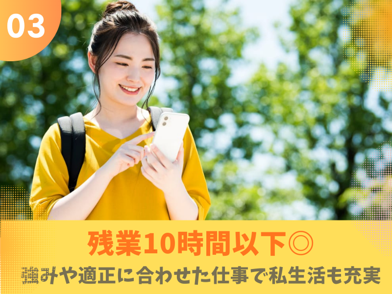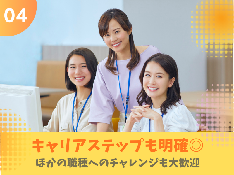 アピールポイント: ◆この仕事が選ばれる、6つの理由 ✼┈┈┈┈┈┈┈┈┈┈┈┈┈┈┈┈✼ ① 「売る仕事」じゃないから、経験の方向転換に最適 お任せするのは、お客様の“困った”を解決する受電対応。 営業や勧誘、ノルマなどのプレッシャーは一切ありません。 接客経験やコミュニケーション力をそのまま活かしながら、落ち着いた環境でのびのび働けます。 ✼┈┈┈┈┈┈┈┈┈┈┈┈┈┈┈┈✼ ② 未経験からでも安心して始められる研修制度 入社後は、社会人マナーや電話応対、PC操作などの基礎研修からスタート。 OJTでは隣に先輩がつき、ひとつずつ丁寧にフォローします。 オフィスワーク未経験だった方も多数活躍中です。 ✼┈┈┈┈┈┈┈┈┈┈┈┈┈┈┈┈✼ ③ 安定した生活リズムと、働きやすい環境 勤務時間は固定シフト制(9~18時、10~19時、11~20時から選択)。 残業は月10時間以下と少なく、夜勤もなし。 年間休日120日以上、私生活も大切にしながら働ける環境です。 服装・髪型・ネイルも自由です。 ✼┈┈┈┈┈┈┈┈┈┈┈┈┈┈┈┈✼ ④ やりたい仕事に近づけるキャリアパス スキルや意欲に応じて、以下のようなキャリアアップも可能です: * SV(スーパーバイザー)としてチームの運営 * 教育担当・アシスタント業務への社内異動 * 採用担当など人事職へのジョブチェンジ(本部正社員登用実績あり) 「この会社でこんな働き方がしたい」──という想いを応援できる組織です。 ✼┈┈┈┈┈┈┈┈┈┈┈┈┈┈┈┈✼ ⑤ 上場グループ企業ならではの安定基盤 東証グロース市場に上場する企業グループの一員として、働く安心感も抜群。 * 月給19万円~ * 残業代は全額支給(1分単位) * 社会保険完備 * 資格取得支援制度 * 昇給あり * 交通費支給(規定あり) * 年間休日120日以上 “安心して長く働ける環境”を、しっかり整えています。 ✼┈┈┈┈┈┈┈┈┈┈┈┈┈┈┈┈✼