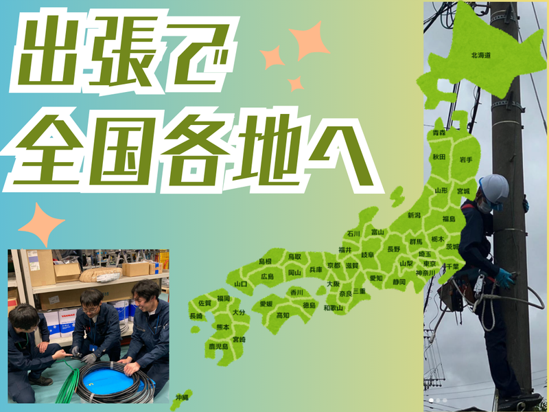 仕事内容 ✨当社で働く魅力 ✅未経験OK!人材育成に全力! ✅働きながら資格取得 ✅良好な人間関係が自慢 ✅年間休日126日! ✅フレックス制度導入で自由度が高い 未経験から社会のインフラを支える、 重要なポジションに挑戦しませんか? - <具体的には> ・放送設備やアンテナの工事 ・電気や通信ケーブルの配線 ・インターホンの設置 ・目標の立案 ・PDCAサイクルを確認 ・法令順守のチェック ・現場の施工管理 など 電気やネットワークを安定して使用できるよう 設備点検や設置を行っております。 作業はチームで行うので ヘルプもすぐに出せる環境◎ 未経験でも安心して働けます! _______ 未経験OKの理由 _______ 社員の90%が未経験スタート♪ 「今後の業界を担う若手を育てたい」 そんな思いから 3年間の育成プランをもとに じっくり丁寧に研修を行っております! 若手を育てる環境を整えているため 社会人デビューや 業界未経験の方、 異業種からの転職者も活躍中! _______ 入社後の流れは _______ まずは、安全に業務にあたれるよう 危険予知訓練(KY活動)について学び、 会社の練習設備を使いながら作業方法をお教えします。 メーカー研修や講習も受けられるので、 基礎から知識をつけていきましょう! いきなり現場に出たり、 「見て覚えてほしい」なんてことは 一切ございません! 現場では、先輩のアシスタントからスタート! 独り立ちまでは3年が目安です。 あなたのペースで焦らず 確実に習得していきましょう! _______ 資格取得支援あり _______ 仕事に必要な資格は 会社負担で取ることも可能です。 向上心のある方は全面的にバックアップ! ゆくゆくは国家資格にも挑戦できるので キャリアアップしたい方にもピッタリ♪ _______ 出張について _______ 現在、当社スタッフの技術力の高さが 信頼と実績に繋がり、 全国各地からの依頼が増えています。 出張は多いですが 「出張手当で稼げるから嬉しい!」 「ご当地グルメを食べることが好き」 「いろんな現場でスキルを上げたい」 そんな前向きな声をいただいています♪ もちろんプライベートを大切にしてほしいので 週末は自宅に帰ったり、 子どもの行事があるから一旦帰社などもOK◎ ‐‐‐ 面接時には希望する働き方や これからやってみたいことなど ざっくばらんにお話ししましょう! あなたにお会いできることを楽しみにしております。