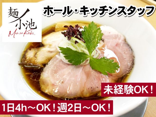 仕事内容 「麺ノ小池」でのホール・キッチンスタッフ(パート・アルバイト)として、 接客・調理補助のお仕事をお願いします 簡単な調理補助やラーメンの提供、皿洗いなので、経験は一切不問です 未経験の方でも、先輩スタッフが丁寧にサポートしますのでご安心ください。 〇夕方からの2時間でも勤務OK 〇土日のみの勤務もできます。 〇週2日~勤務OK! 〇未経験者歓迎!経験は一切不問 〇学生バイトや主婦(主夫)パートさん、Wワークの方にも最適! 〇嬉しい昇給あり! 空いた時間を有効活用したいフリーターさん、Wワーカーの方はもちろん、 学生さんも試験前の空いた時間や休日など、 プライベートでガッツリと充実した働き方ができます。 また、接客のお仕事をやってみたい方、アルバイトデビューしたい方、 普段の収入にもう少しプラスしたいパートさん、そんな方も大歓迎です! もちろん業界未経験・飲食業界経験者の方も大丈夫! レストラン、食堂、居酒屋でのホール・キッチンスタッフの 経験がある方もスキルを活かして大活躍できます! 【仕事の詳細】 らーめん店でのホール、キッチンスタッフ(パート・アルバイト) ・接客(水の提供、注文取り、料理の配膳) ・調理補助 ・テーブル、食器の片付け、食器洗い、店内の清掃、消毒 ※簡単な作業をお願いするので、経験は一切不問です 【ここがポイント】 ・パート、アルバイトでも高収入可能です ・時給は1,100円~! ・もちろん残業代全額支給します。 ・あなたの頑張りに応える昇給制度あり! ・学生さんには助かる食事補助もあります! ・頑張りをしっかり評価する制度がしっかりしています 当店はスタッフ一人一人を大切にしております 少しでも不安な点はご相談ください。 詳細は面談の際にご説明いたします 【こんな方にオススメ】 ・働く時間帯を選びたい方 ・空いた時間を有効活用したい主婦(夫)さん、フリーターさん、学生さん ・収入にプラスしたいWワーカーさん ・扶養範囲内で働きたいパートさん ・飲食店、接客業の経験がある方 ・飲食や接客の経験は無いが、チャレンジしてみたい方 ・アルバイトデビューしたい方 【麺ノ小池について】 あの人気店、竹末食堂で腕を磨いた職人が2024年2月にお店を開きました。 舌の肥えた通のお客をも唸らせる自慢の味で、 人気のラーメン屋さんがひしめく県南地区に新たな風を吹き込みます。 【応募方法について】 WEB応募よりエントリーをお願いしております 直接お電話で応募を希望される場合、また、質問などにつきましては 担当者直通.090-5551-5432 までお願い致します 尚、飲食店につき、電話については業務中はすぐにご対応できない場合もございます 予めご了承ください