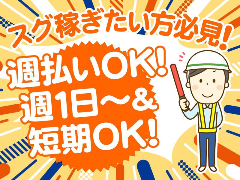 待遇・福利厚生 【福利厚生】 ・制服貸与(無料) ・交通誘導1級・2級所持者は手当有 ・各種手当有 ・週払いok(規定) ・早く終わっても日給全額支給(規定)