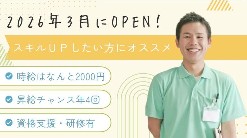 職場環境 2026年3月オープンの新しい施設!スタッフ同士の関係性もゼロからのスタート。既存施設では、10代、20代、30代、40代、50代、60代と幅広い年代が活躍中♪年齢や前職に関わらず意見を出し合い、皆で協力しながら施設づくりを進めていきたいと考えています。 喫煙所:なし(敷地内全て禁煙)