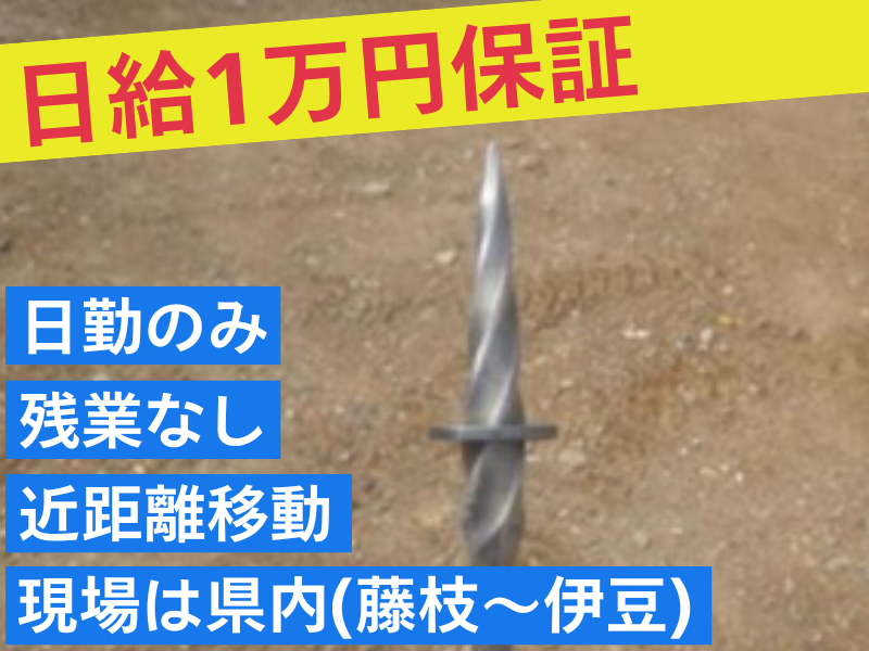 仕事内容 未経験OK!フリーター歓迎! ✅一軒家を建てる前の地盤を調査する仕事 ✅1日の流れは…現場で測定 ☞ 帰宅後に自宅でデータ入力‼ ✅1日最大2現場、調査は最大4件◎ ●日給1万円保証! 安定収入でしっかり稼げる! ●現場は藤枝~伊豆 近距離移動だから負担少なめ ●直行直帰&在宅勤務OK! 自由な働き方が叶います ●フリーターから正社員を目指せるチャンス <面接前・仕事開始前の職場見学OK> まずは雰囲気をチェックしてください ■■■■■■■■■■■■■■■■■■■■ 【具体的なお仕事内容】 1. 土地や地層の調査 新しく家を建てる場所の地盤が しっかりしているかを確認するため 専門の機械を使って 地面の硬さや深さを調べます。 2. 現場での自動測定 調査では、現場で機械を使って 自動的に数値を測定します。これにより 地盤の状態や特性を正確に把握します。 3. データの整理と報告書作成 現場で集めたデータは 帰宅後に自宅でパソコンに入力します。 その結果をもとに、土地の状態や適性に ついての報告書を作成し、関係者に提供。 現場は藤枝から伊豆まで、直行直帰です。 現場に9時着できるよう移動して頂きます。 1日最大2現場、調査は1日最大4件まで! 1日の工程表により、 午前中で終わる日もありますよ◎ 仕事は「測定→入力」の繰り返しなので 覚えてしまえば難しいことはありません。 「この土地は安全に家が建てられるかな?」 「地層に問題はないかな?」など 一軒家を建てる前の土地の地盤を調査し 問題がないかを確認するお仕事です。 「土のお医者さん」とも呼ばれています。 ■■■■■■■■■■■■■■■■■■■■ 【フリーターさんへのおすすめポイント】 ⭐未経験OK!特別なスキルや資格は不要◎ ⭐直行直帰OK 在宅勤務ありでプライベートも充実! ⭐9:00~17:00勤務 残業ほぼなしで働きやすい! ⭐1日最大2現場で、 午前中だけで終わる日もあります◎ 「実際の現場を見てから決めたい」 という方も安心です。 面接前の職場見学OK! 気軽にご参加ください◎ ■■■■■■■■■■■■■■■■■■■■ 【未経験でも安心】 今活躍中のほとんどのスタッフが 未経験からのスタートしています。 調査の進め方や1日の流れはあらかじめ 決まっており、最初は先輩と一緒に工程表を 見ながら現場を回ります! 作業内容は「測定 → データ入力」という 決まった流れの繰り返し◎ 専門的な判断をその場で求められることは 無いのでご安心ください。 また、PC作業も数値入力や 簡単な文章作成が中心です。 慣れるまでは必ずフォローがあり、 一つずつ確認しながら覚えていけます。 おおよそ1ヶ月ほどで一通りの作業に慣れ、 無理なく独り立ちできる体制を しっかりと整えています。 ■■■■■■■■■■■■■■■■■■■■ 「そろそろ安定したい」 「正社員を目指したい」 そんなフリーターの方、大歓迎! まずはお気軽にご応募ください♪