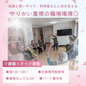仕事内容 介護サービスやレクリエーション、 食事の補助等をお願いします。 小規模施設なので利用者様との距離も近く コミュニケーションも取りやすい! 大きな施設で流れ作業が辛いと悩んでいた staffも当施設へ転職後のびのび活躍中! ―――――――――――――――――― 当社は「一歩ずつ、寄り添う介護」を モットーに、ご利用者様一人ひとりの 尊厳を大切にし、心のこもったケアを提供しています。 私たちは、ただ日々の介助を行う のではなく、ご利用者様の人生に 寄り添い、安心と喜びを届けることを使命としています。 介護とは、単なるサポートではなく、 その方らしい生活を支える大切な仕事です。 ご利用者様が笑顔で過ごせることが、 私たちにとってのやりがいとなり、誇りとなります。 当社で勤務してくれているスタッフたちは、 チームワークを大切にしながら、 それぞれの専門性を活かして活躍しています。 介護職は日々のケアを通じてご利用者様の生活を支え、 生活相談員はご家族との橋渡し役となり、 看護師は健康管理を担いながら医療面でのサポートを行います。 当社では、スタッフ一人ひとりが 自分の役割を果たしながら成長し、 より良い介護を提供できる環境を整えています。 ぜひご応募いただく皆さんがのびのび 活躍できる環境をご用意してお待ちしております! ―――――――――――――――――― 平塚駅、大磯駅、茅ヶ崎駅、北茅ヶ崎駅、 香川駅、寒川駅、宮山駅、倉見駅、 門沢橋駅、社家駅、厚木駅、海老名駅、 本厚木駅、愛甲石田駅、伊勢原駅、 鶴巻温泉駅、東海大学前駅、秦野駅 などから通勤するスタッフ活躍中! ――――――――――――――――――