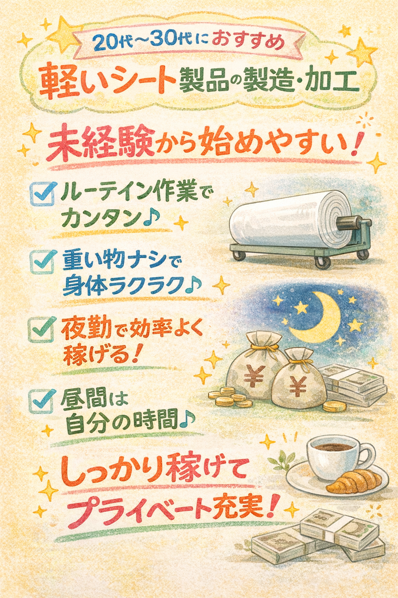 求めている人材 ●学歴、経歴不問 ●未経験歓迎 ■こんな方におすすめ ・コツコツ作業が好きな方 ・しっかり稼ぎたい方 ・工場未経験からスタートしたい方 ■働き方のポイント ・重いものナシで安心◎ ・深夜勤務ありで高収入可能 ・平日昼間を自由に使える生活スタイル 「夜勤はきつそう…」と思う方も、 **慣れると意外と快適!**という声が多数です◎