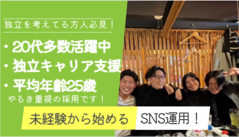求めている人材 ◆学歴不問 ◆経験不問 ◆未経験OKです♪ ※経験やスキルよりも「挑戦してみたい」 という気持ちを大切にしています! ■必須条件 ・週3日以上勤務できる方 ・明るく受け答えができる方 ・将来的に成長したい意欲がある方 ■歓迎条件 ・SNSや動画に興味がある方 ・仕事を楽しみたい方 ・スキルを身に付けたい方 ・将来独立を考えている方 ・自ら積極的に成長する意欲のある方 ・チームで仕事をするのが好きな方 ・同世代のコミュニティに所属したい方 上記、ひとつでも当てはまる方大歓迎! 特に「ゆくゆくは自分の力で 独立したい」「自分で実力をつけて やっていきたい」という方を歓迎します。 未経験からでも安心して始められる 環境が整っていますので、スキルより もチャレンジ精神を重視します! 当社は、将来のキャリアについて 考えている方にぴったりの環境です◎