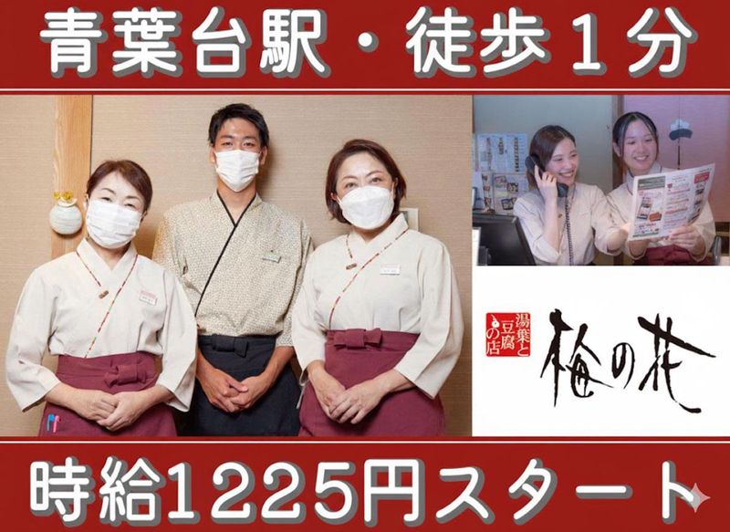 仕事内容 *************** ☑時給1225円スタート ☑土日祝は時給1275円 ☑青葉台駅徒歩・1分 ☑駅チカの一戸建てのお店 ☑週2日・1日3時間~OK ☑シフトは融通します ☑ライフスタイルに合わせた勤務 ☑綺麗で落ち着いた和食店 ☑未経験も安心の丁寧な研修 *************** 湯葉と豆腐のをベースにした 懐石料理店「梅の花」のホールスタッフ。 お客様に食事を通して満足のいく時間を 過ごしていただけるよう心のこもった ”おもてなし”をお願いします。 笑顔が大切なお仕事です。 ■どこでも通用する ”言葉遣い””マナー””一般常識”が 自然と身に付くお仕事です■ 【仕事内容は】 ・予約席のセッティング ・受付応対 ・お席へのご案内 ・お茶出し、オーダー伺い ・配膳 ・テーブルの片付け 【具体的には】 □ご来店いただいたお客様へのご対応 □ご予約頂いたお客様のご予約席へのご案内。 □ご予約いただいている料理の確認やオーダー □料理やドリンクの提供 □簡単なドリンクもつくっていただきます □お客様がお帰りになった後の席の片付け 【教育体制も充実】 入社後、最低でも1週間は、 社員や先輩がマンツーマンで教えます。 最初は、解らない事だらけだと思いますが、 じっくりお教えしますので安心してください。 言葉遣いや挨拶の仕方等から始めますので、 未経験でも安心してスタートできます。 あなたが納得するまでお教えします。 解らない所は気兼ねなく質問して下さい。 *************** 未経験から育てるノウハウと 働き易さ抜群の職場 *************** 入社後、最初にすることは お客様としてお店での食事体験です。 梅の花を自分の肌で、そして自分の舌で お店全てを体感していただきます。 次に、動画やテキストを使った 座学で、お店のことや業務の 基本を学ぶことからスタート☆ その後、現場に入り実際の業務を 先輩に教わりながら身につけていきます。 できるようになるまでは常に サポートしますのでご安心です♪ 梅の花は独自の研修システムを用意しています。 <<梅の花 横浜青葉台店>> 湯葉と豆腐をベースにした創作懐石料理店。 落着いた綺麗な店内は老舗旅館や 高級和食店を彷彿さる一戸建てのお店。 リーズナブルな料金で高級感を味わえると 女性のお客様を中心にご支持を頂いています。