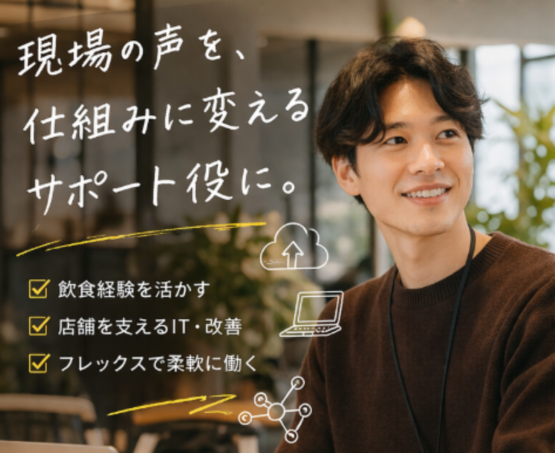 仕事内容: ・。*゜・。*。゜*..゜*・。..*・゜.*..゜* ~現場は好き。でも「もっと良くできるのに」と感じたことはありませんか?~ ◆飲食での現場経験を活かし、店舗運営を支える“仕組みづくり”に関われるポジション ◆店舗と本部をつなぎ、より働きやすい環境づくりを担う本部スタッフ ◆フレックスタイム制で柔軟な働き方が可能 ・。*゜・。*。゜*..゜*・。..*・゜.*..゜* ⏩ 仕事内容 ⏪ 本社「運営支援部」にて、店舗運営を支える環境づくりや改善業務をお任せします。 店舗と本部を横断しながら、 現場の課題や声をもとに、より働きやすく・運営しやすい仕組みづくりに携わっていただきます。 ITの専門職というよりも、 現場経験を活かしながら、ツールや仕組みを使って改善していくポジションです。 <具体的には> ✓ 店舗で使用するPC・タブレット・POSなどの管理や簡単な設定 ✓ デジタル機器の導入サポート・運用フォロー ✓ 店舗・本部からの問い合わせ対応(操作方法など) ✓ 店舗運営をスムーズにするための環境整備(インフラ含む) ✓ 現場の課題をもとにした業務改善やツール活用の提案 ✓ 店舗・本部と連携したオペレーション改善 ※すべてを最初からお任せするわけではなく、できることから少しずつお任せしていきます。 ============== ★ココがPOINT★ ============== ◎店舗と本部をつなぐポジション! ∟現場の声をもとに、より良い運営を支える役割です。 ◎裁量を持って改善提案ができる! ∟「もっとこうしたい」を仕組みで実現できます。 ◎ブランドを裏側から支える仕事! ∟日々の運営を整えることで、店舗の力を引き出します。 ◎幅広い経験が身につく! ∟店舗運営・本部業務・IT活用など横断的に関われます。 ◎ITは“できればOK”からスタート! ∟入社後に少しずつ学んでいける環境です。 ⏩ 運営支援部とは ⏪ 店舗運営を支えるバックオフィスとして、 環境整備や業務支援などを担う部署です。 今回のポジションは、その中でも 店舗と本部をつなぎながら、 ITやツールも活用して運営をより良くする“仕組みづくり”を担う役割。 現場の力を最大化するために、 裏側から支えていく重要なポジションです。