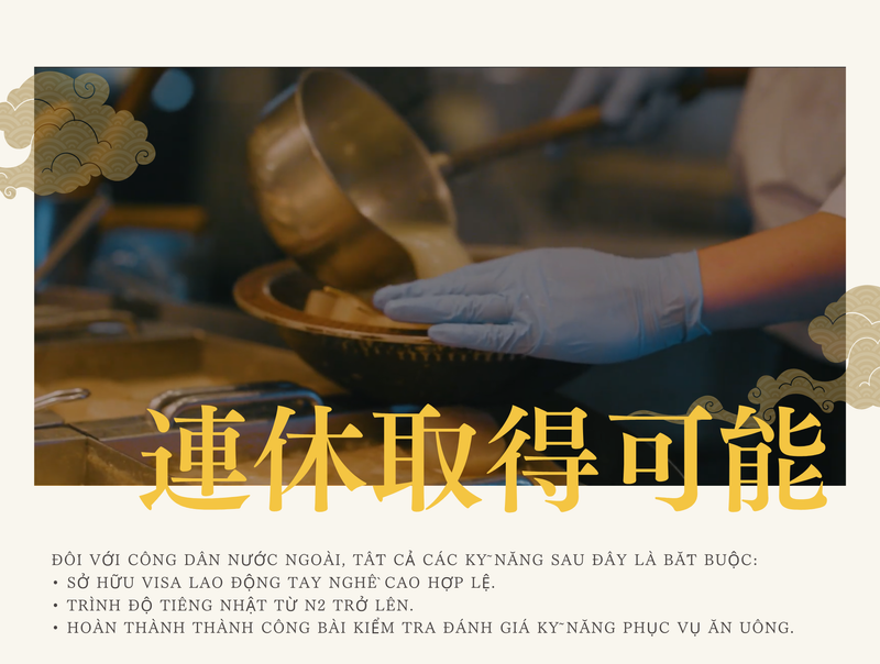 選考プロセス ★外国の方は以下の全てのスキルが必須となります。 ・特定技能ビザ取得者 ・日本語レベルN2以上 ・外食試験合格者 【STEP1】応募 内容を確認後、担当者よりご連絡します! 【STEP2】面接日程調整 在職中の方も調整しますのでご安心ください! 【STEP3】面接(1回のみです) リラックスしてお越しください◎ これまでのご経験や、働き方の希望などをお聞きします。 【STEP4】内定・入社 条件面を確認のうえ内定!入社日は相談可能です。