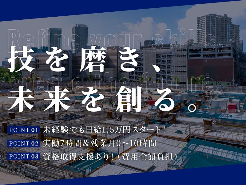 仕事内容 / 未経験から好待遇の環境! ココからプロを目指そう! \ ――`★当社の魅力ポイント★‘―― ✅未経験でも日給1.5万円スタート ✅資格取得支援あり(費用会社負担) ✅実働7時間で負担少なめ ✅残業0~10時間程度 ✅住宅手当あり(要相談) ✅髪型・髪色自由やピアスもOK ✅履歴書必要なし! ✅最短翌日勤務可能! ――――――――――――――― 【こんなお仕事をお任せ!】 ・高層マンションや物流倉庫での PC架設工事や鍛冶工事(型枠工事含む) ・敷鉄板の溶接・払し作業 ・各種金物の溶接・溶断作業 <ポイント> ・ゼネコン1次下請け中心で仕事量○ ・直行直帰OK(現場は1時間程度) 【入社後の流れ】 最初は簡単な作業からスタート! 慣れるまで先輩スタッフが 丁寧にサポートします! 必要な道具は会社から新品を支給 身一つで入社可能です!