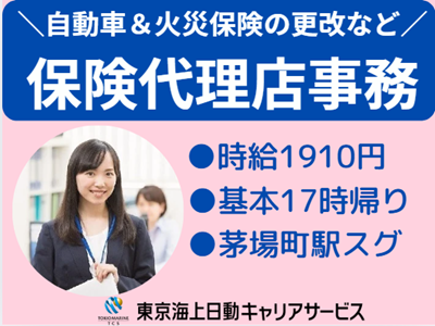 仕事の内容 \@1910円!決まった時間で収入↑/ ◆基本17時退社で月26万~可 ◆年1回、正社員登用のチャンスあり(公募制)*頑張りをキチンと評価◎ @茅場町駅チカ *移転したばかり!新しくキレイなオフィス 【基本情報】 雇用形態:派遣社員 雇用期間:長期(3カ月以上) └ 4月~開始日相談可能 就業時間:9:00~17:00(休憩60分) 【必須条件】 ◆損保事務のご経験 ◆パソコン:基本操作(入力~修正) 【お仕事内容】 個人契約(団体扱い)に関する契約更新業務 ・書類発送 ・返送書類チェック ・対応履歴入力 ・更新の督促 ・郵便物仕分け ・帳票請求など *扱い:東京海上日動 *種目:自動車(7割)、火災(3割)、傷害 ◆安心のチーム制! └わからないことは質問、確認をしながらお仕事できる環境 └e-zone、スマらく手続きを使用 *業務にあたり 損保募集人資格が必要です 【環境面等】 ・30代・40代・50代の多い職場 └子育てに理解ある主婦・主夫活躍中 ・ランチタイムは休憩スペース利用OK └お弁当持参OK/近くには飲食店多数 ・オフィスカジュアル内で服装自由 【福利厚生等】 ・社会保険完備 ・ベネフィット・ステーション ・定期健康診断あり ・禁煙オフィス!煙苦手な方も安心 ・平日のみOK!土日祝休み ・年間休日120日以上&お休み相談可 └有給休暇、年末年始休暇など ~損保スキルいかして決まった時間で安定収入が叶います! ご応募はお早めにどうぞ♪~ ○●嬉しいPOINTたくさん!●○ 履歴書不要!開始日相談ください/駅歩5分以内の駅チカ環境/ブランクOK!主婦・主夫活躍中/基本17時退社◎!子育てに理解のある職場/頑張り次第では…正社員登用あり
