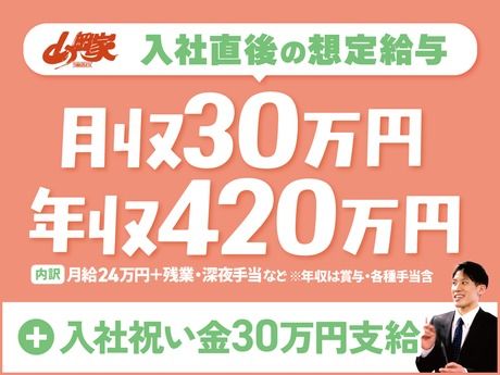 仕事内容 \ 最短1年で店長へ / 飲食経験者歓迎(ジャンル不問) ** キャリアアップを目指す方必見! ** 業界屈指の安定基盤を誇る《丸千代山岡家》で、 「1~2年後に店長」を目指して働きませんか! ★らーめん店の経験がなくても大歓迎です!! <店長:月給43万円~> <ミドル店長:月給46万~60万円> ====================== 成長加速&エリア拡大中に伴い、 正社員を“積極採用中”!(2024年実績:180名以上) ====================== SNSやメディアで日々話題になる山岡家のラーメン。 ―でも、選ばれているのはラーメンだけではありません! 実は「働く場所」としても多くの人に支持され、 30~40代で転職した男性社員も多数活躍中! 現在は、西日本エリアで幅広く出店が加速中! 2026年も成長スピードはさらにアップします!! \ 四国初進出! / 4月3日、香川県に「高松中央インター店」がオープン予定! \ 博多区にも出店 / 4月22日、九州福岡に「福岡月隈店」がオープン予定! 福岡市内2店舗目、博多区初出店です!! 【スムーズに業務を始めていただくために…】 入社後は、茨城県つくば市にある自社の トレーニングセンターで研修を実施(3泊4日) ※研修中の交通費・宿泊費は全額会社負担! ※研修中もしっかり給与支給で安心スタート ====================== \ここがポイント/ 1)最短1年で「店長」へキャリアアップも可  ̄ ̄ ̄ ̄ ̄ ̄ ̄ ̄ ̄ ̄ ̄ ̄ ̄ ̄ ̄ ̄ ̄ ̄ ̄ ̄ ̄ 《昇進例》 ◆一般社員・・・・・【年収420万円/月給24万円】 ◆アドバンス社員・・【年収470万円/月給28万円】 ◆店長・・・・・・・【年収580万円/月給43万円】 頑張りがそのまま昇進に繋がるのが “山岡家”。 評価制度が明確で着実に仕事を覚えられるから、 未経験者も3年で店長になる社員が多数! ★経験者なら、よりスピード昇進が可能!! ★その後もエリアマネージャーや幹部候補、 本社スタッフ、スーパーバイザー(SV)など、 多彩なキャリアパスをご用意しています! 2)東証スタンダード上場企業の安定基盤  ̄ ̄ ̄ ̄ ̄ ̄ ̄ ̄ ̄ ̄ ̄ ̄ ̄ ̄ ̄ ̄ ̄ ̄ ̄ ◎今なら!入社祝い金30万円支給!! ◎残業代は1分単位で全額支給(みなし残業なし) ◎昇給・賞与は年2回!! ◎特別休暇を合わせて、実質年休111日! ◎有給平均取得日数7.5日(土日取得もOK!) ◎プライベートの都合に配慮したシフト希望休OK ◎女性だけでなく、男性社員の育休取得実績あり ◎20年以上活躍する社員も在籍する定着率の高さ ====================== 【お仕事について】 ゆくゆくは店長として、 アルバイト採用やスタッフ教育などの人材育成、 売上・利益率の管理、月次損益書の作成、 自店舗の目標達成に向けた運営戦略の立案・ 実行などをお任せしたいと考えています! <入社後の流れ> まずはホール業務からスタート! お店全体の流れや雰囲気をつかみます。 ▼ キッチン・洗い場・仕込みなども習得! 冊子のマニュアルや、店舗タブレットでも 視聴できる動画教材があるのでスムーズ! ▼ 店舗全体の流れを理解したら、 スタッフ育成や売上管理、発注業務など 店舗運営の中核を担うポジションへ。 ▼ 店長として、運営業務を一任します! ※接客・マニュアル・動画はすべて日本語です。 ※また、衛生記録なども日本語で記入します。 ・・・・・・・・・・・・・・・・・・・・・・ <店長インタビュー:30代・男性・ミドル店長> ・・・・・・・・・・・・・・・・・・・・・・ Q.【山岡家を選んだ決め手は?】  ̄ ̄ ̄ ̄ ̄ ̄ ̄ ̄ ̄ ̄ ̄ ̄ ̄ ̄ ̄ ̄ 店長に運営を任せるスタイルに魅力を感じました! セントラルキッチンを持たずに、 仕込みからすべて店舗で手作りしている 山岡家のラーメンが大好きだったことも理由です。 今では自分で判断できる領域が広くなり、 経験を積むほどお店づくりが面白くなっていますね! Q. 【店長としてのやりがいは?】  ̄ ̄ ̄ ̄ ̄ ̄ ̄ ̄ ̄ ̄ ̄ ̄ ̄ ̄ ̄ ̄ 人を育て、“強い店”をつくれることです! 特に新店の立ち上げはゼロから組み上げる分 大変ですが、その分やりがいが大きいですよ。 スタッフたちと積極的に関って、楽しく働けるよう コミュニケーションを取ることを心掛けているので、 スタッフが成長する姿を見ると、 店長としての自分の仕事にも誇りを感じます! <異動も “成長チャンス” として全力サポート> 週休2日制の正社員には全国転勤がありますが、 山岡家の異動は「経験の幅が広がる機会」として活用。 新しい環境で視野が広がることで、 評価につながりやすい仕組みになっています! <転勤や研修も安心の制度あり!> *全国への転勤費用・引越し費用は全額会社負担 *異動に伴う帰赴任手当なども全てサポート! 【丸千代山岡家について】 全国に190店舗以上のラーメン店を運営中。 売上好調!前年比平均10%以上の成長率! 47都道府県への出店を目指し、新店OPENも続々。 セントラルキッチンを設けず 全店直営&店内手作りにこだわる姿勢で、 根強いファンもたくさんいます! リピート率はなんと75%超え!(自社調べ) <売上高> 186億7600万円(2023年1月期) 264億9400万円(2024年1月期) 345億8500万円(2025年1月期)*前年比130.5%! 《HP
