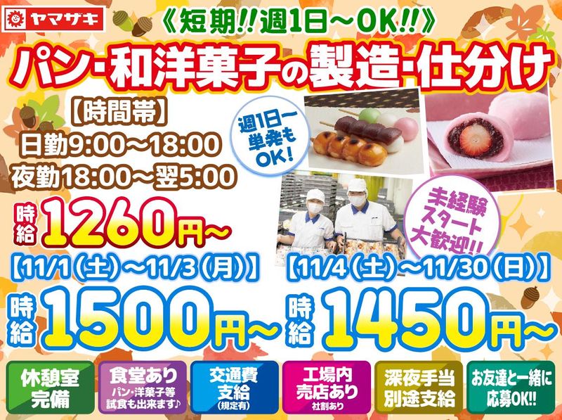 仕事内容 *・・・*・・・*・・・*・・・*・・・*・・・* 《短期スタッフ募集!!》 決まった作業を決まった手順で◎ そんなシンプル作業が中心です♪ 先輩が丁寧にサポートしていきます! *・・・*・・・*・・・*・・・*・・・*・・・* 《⭐期間限定時給で稼ぎも◎⭐》  ̄ ̄ ̄ ̄ ̄ ̄ ̄ ̄ ̄ ̄ ̄ ̄ ̄ ̄ ̄ ̄ 下記期間は「時給1450円~1650円」 ⏩11/1(土)~12/31(水) ※詳細は給与欄参照 ※短期アルバイトスタッフのみ ★創業70年以上!! 有名な食パンや菓子パンなどを 食卓にお届けするお仕事です♪ スーパーやコンビニでお馴染みの 食パン・菓子パン・調理パンや和洋菓子、 おにぎりetc… 様々な製品を日々製造しています。 扱う数は約1200種類、 1日の製造数は約3000万個!! 仕込み→成型→焼成の製造工程を経て、 包装して仕分け作業に入ります。 仕事内容も多岐にわたるので 飽きることなく働けます♪ =============== 《交通アクセス》 小平駅より徒歩14分! ⭐バイク・自転車通勤OK! 萩山駅、久米川駅、青海街道駅、 八坂駅、花小金井駅、新小平駅、 一橋学園駅、東村山駅、小川駅、 国分寺駅、田無駅、東久留米駅 …などからもアクセス便利◎ =============== 《応募後の流れ》 応募→説明会・面接→勤務スタート! 応募後、説明会を行い面接を実施します。 【勤務地・面接地までの行き方】 「小平駅」北口より徒歩3分のバス停から ぶるべー号に乗車→ 大沼地域センター公園、下車徒歩5分 当日はラフな格好でOK! 1~2時間程度で終了します。 面接前に聞きたいことなどございましたら、 お気軽にお問い合わせ下さい♪ ※応募書類の返却はしておりません。 =============== ■実際に働いているスタッフの声■ 好きな日にちにシフトを入れられるので 自分の都合に合わせて働けるのが とても助かっています♪ 作業も簡単で気楽ですし、 食堂も363円~と安いので効率良く稼げます。 隙間時間で働けるので、 気づいたら長年働いていた! という方も沢山いらっしゃいます。