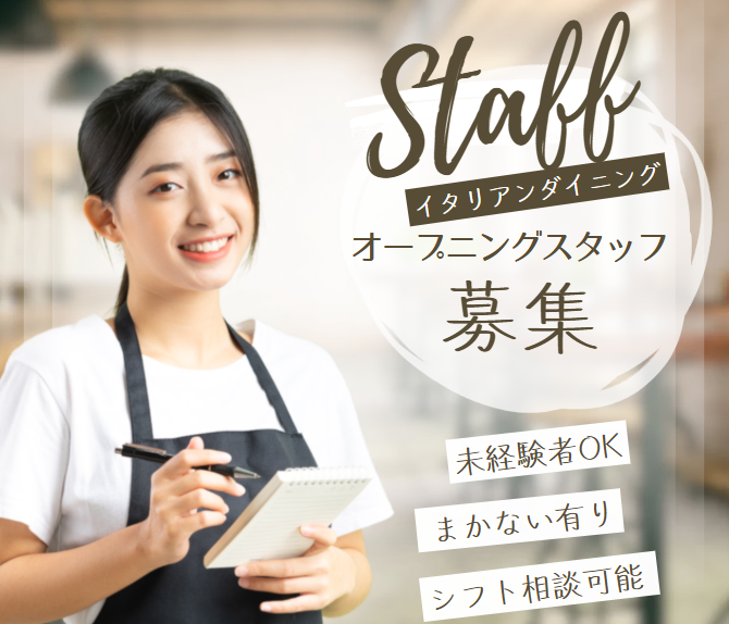 仕事内容 ✨˖✧˖✧˖✧˖✧˖✧˖✧˖✧˖✧˖✧✨ カジュアルイタリアンのお店 『Coris dining』 スタッフ募集! ✨˖✧˖✧˖✧˖✧˖✧˖✧˖✧˖✧˖✧✨ まだオープンして半年の新しいお店です! 一緒に素敵なお店を作っていきませんか? <具体的な仕事内容> ・ホール業務(オーダー確認、配膳、片付け、お会計など) ・調理補助業務(簡単な盛り付け、ドリンク、洗い物など) できることからお任せしていきます! もっと「スキルアップしたい」「腕を試したい」方も大歓迎です。 〇こんなお店です =================== ・席数:30席 ・営業時間:11:00~24:00 ・定休日:不定休 ・メニュー:スープ、前菜、肉や魚を使用したメイン料理、パスタやピザなども含む洋食中心の料理 ・客単価:3000円~7000円 ・客層:平日 主婦/土日 ファミリー └さまざまなお客様が来店されるので年代問わず活躍できる職場◎どなたでもお気軽にご応募ください。 〇おすすめポイント =================== ✅”頑張りたい”を応援中 「いずれは自分の店を持ちたい」 「もっと色んなことを学びたい」 「堅苦しい規則に縛られたくない」 そんな意欲のある方を全力で応援します! ✅未経験大歓迎! 意欲を重視した採用です♪ 最初は誰でも未経験なので安心してご応募ください。 少しずつ教えていきますよ! ✅自由度抜群 働きやすさも抜群! 勤務時間や日時の相談が出来るので 履修登録やテストがある時、 長期休みで旅行に行きたい時なども相談してください! バイトも私生活も全力で楽しみたいそこのあなた! 当店で働くと実現できますよ! ✅まかないあり 飲食店で働く醍醐味♪ 当店も美味しいまかないをご用意いたします!