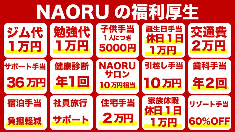 仕事内容 ✅オープニングスタッフの募集! ✅ジム代補助や住宅補助など手当充実♪残業少なめ ✅高インセンティブ制♪ ✅会社負担の手厚い研修体制アリ! 【✨詳細】 3月オープン予定のNAORU整体の新潟の新規店舗にて、施術を担当頂きます。 具体的には筋肉調整 ・骨格調整 ・ 神経整体 ・ 関節整体 ・ 姿勢/骨盤矯正等。 保険業務は一切なし。 ご希望の方には店舗運営業務全般にも関わっていただけます。 カウンセリング ・スタッフ育成 技術もマネジメントも身につくため、 「将来の独立・開業」「キャリアアップ」を本気で目指せる環境です。 研修も手厚く、20日間の外部研修を会社負担で行うことなどもございます。 また、すでに1名理学療法の経験のある20代後半のスタッフが入社予定です。
