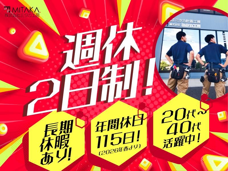 仕事内容 \\週休2日制!長期休暇あり❗// ⭐【 人柄重視 】の採用です!⭐ ━━━━━━━━▼━━━━━━━ ⏩学歴不問!無資格ok! ⏩研修・福利厚生が充実!働きやすい◎ ⏩昇給年1回!賞与年2回! ⏩頑張りはしっかり評価し給与に反映! ⏩ノルマなし!充実した研修で安心! リフォーム専門店でのお仕事です! ●具体的には… ◇大工・内装等の工事 ◇工事前工事中や工事後のお客様対応 ◇PCやスマホでの工事報告や写真のアップ ✅ 研修が充実! ―――――――――― 入社後は、先輩社員に同行し、 まずは業務を覚えることからスタート! 指導を受けながら、水回り・外壁塗装などの 専門知識や技術を身につけます。 しっかりした研修があるのでリフォームのお仕事についてしっかり学べます。 頑張った分だけきちんと評価されるから高収入も望めます! ✅ ミタカ工房について ――――――――――――― 創業26年!施工実績・件数 群馬県内最多の地域密着総合リフォーム店! 地域密着を基本方針に掲げ、スタッフ・お客様・業者・地域など全てを幸せに出来る仕組みづくりに努めています。 社内外の研修など、能力の向上や結束を高める環境づくりに力を入れています。 住宅リフォームは前橋市内にショールームを2店舗構え「見て、さわって、納得できる体感型ショールーム!」として、お客様が来店して頂くスタイルになっており、大変ご好評いただいています。