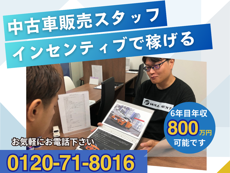 仕事内容 ✨新着求人✨ ウィルネクスト厚木店新規オープン! \オープニングスタッフ大募集!/ 2025年6月に7期目スタート! 毎年増収増益で、全国展開を 全員で目標に掲げているウィルネクストが 厚木市岡田の地に新規店舗をオープン! ◆―――――おすすめポイント――――◆ ✨新規オープン店!綺麗な職場で働けます◎ ✨販売1台ごとに【1万円〜3万円】の インセンティブ支給 ✨月15〜25台販売で【月収+15〜50万円】 ✨成果がそのまま収入に反映されます ✨普通免許と車が好きならばOK!! 稼げるようになるまでしっかりサポート ✨【未経験歓迎/学歴・年齢不問】 まずはお気軽にお問い合わせください! TEL:0120-71-8016 ◆―――――――――――――――――◆ 未経験からでもしっかり稼げる! \中古車販売スタッフ募集/ ✨【お仕事内容】✨ 中古車の販売営業をお任せします! カーライフアドバイザーとして、 お客様一人ひとりに寄り添い、 素敵なカーライフをサポートします。 【具体的には】 ✅ご来店のお客様や、電話・メールで お問い合わせいただいたお客様への対応 ✅中古車のご提案・販売 ✅広告媒体への掲載 ✅車の商品化(洗車やメンテナンスなど) ✅車好きにはたまらない! 豊富な車種を扱うので、 毎日がワクワクの連続です♪ お客様のニーズを丁寧にヒアリングし、 最適な1台をご提案してください。 「人と話すのが好き」 「誰かの役に立ちたい」 そんな気持ちがあれば、 即戦力として活躍できます! 【そのほかにも】 ✅洗車 ✅車両の店舗への回送 ✅書類作成や登録業務(陸運局関連)などの 事務作業もお任せします。 ✨☆入社後のサポートも充実☆✨ 営業の基礎から接客マナー、商品知識まで、 ゼロからしっかりレクチャー! 慣れるまでは先輩がマンツーマンで サポートするので、 未経験でも安心してスタートできます。 ★\経験・知識は一切不問!/★ 「とにかく稼ぎたい」 「自分を成長させたい」 「車が好き」—— そんな想いを持ったあなたを スタッフみんなお待ちしています! ✨2019年に法人化したばかりの当社は、 国産車や輸入車を幅広く取り扱っており、 自社の認証整備工場もスタートしました。 ご愛顧いただいているお客様はもちろん、 成長意欲のある社員の頑張りと強い思いから 業績好調、右肩上がりで成長中! お問い合わせやご来店等、 対応件数は600件を超えています。 営業が対応しきれないほど、 数多くご来店していただいており、 あなたの助けを必要としています! チーム一丸となって日々業務に 取り組んでいますので、このミッションに 賛同して一緒にかんばってくれる方を 心からお待ちしています!