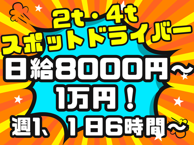 仕事内容 ✨週1日~OK!出社日調整可! ✨実働6時間~様々な案件あり! ✨稼働分前払い制度あり(規定) ✨車バイク通勤OK!ご相談を! <仕事内容> ⏩スポットでの配送ドライバー! 2t・4t車による配送をお任せします。 配送先により勤務時間は変動しますが、 1日6時間以上~は必ずあります! ✦・┈┈┈┈┈┈ ・✦✦・┈┈┈┈┈┈ ・✦ ✨出勤日の調整が融通ききます!  ̄ ̄ ̄ ̄ ̄ ̄ ̄ ̄ ̄ ̄ ̄ ̄ ̄ ̄ ̄ 「今月ガンガン稼ぎたい」 「ほどよく稼ぎたい」 「今月出費が多いからシフト多めに」 「週1・2日でWワーク」 などそれぞれの希望に合わせて 毎月出勤日の調整が可能です! 無理せず働けるから続けやすい♬ ✦・┈┈┈┈┈┈ ・✦✦・┈┈┈┈┈┈ ・✦