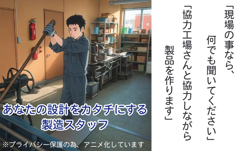 選考プロセス 担当者より面接調整のご連絡 ∟ご希望の日時をお伺いし、柔軟に対応いたします。 ↓ 面接実施(基本1回!) ∟堅苦しい雰囲気ではありません。 あなたの「モノづくり」への想いをお聞かせください。 ↓ 面接終了後、7日以内に選考結果をお知らせします。 合否に関わらず、必ずご連絡いたします。 ※状況によっては、即日採用も可 ↓ お仕事開始! ご応募、心よりお待ちしております! ご不明な点はお気軽にお問い合わせください。