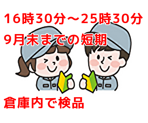 ■仕事内容 9月末までの短期のお仕事です! ■■■お仕事について■■■ <見学OK!即日スタート可能> 開始日は相談ください♪ お仕事内容は・・・ ・冷蔵倉庫内で検品 ・出荷前の食料品の「商品チェック」や「数量チェック」 未経験OK♪ 几帳面な方にはピッタリなお仕事 30代、40代、50代の女性活躍中 車通勤OK 暑い時期だからこそ冷蔵倉庫でのお仕事が嬉しい! 週払いができるので急な出費も安心 気になる職場の雰囲気、仕事内容の詳細など、職場見学で一緒に確認しましょう♪ ■仕事の特徴 車通勤OK バイク通勤OK 髪型・髪色自由 服装自由 即日勤務OK フルタイム歓迎 シフト制 学歴不問 未経験・初心者OK ブランクOK 経験者・有資格者歓迎 中高年応援 資格不問