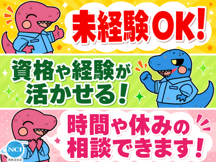 PR・職場情報 =====ここがポイント===== ■フォークリフト免許を活かして働ける、農産物の配送スタッフ募集です ■8:30~16:30の日勤のみで、日曜休み+他会社カレンダーのお仕事です ■配送未経験の方も、先輩社員の同行研修があるので安心してスタートできます ■お給料週払い/送迎対応もOK! ==================== ▼安心のフォロー体制▼ 就業してからも当社営業スタッフがしっかりフォローしますので、派遣が初めての方や未経験のお仕事に不安のある方も安心してお勤めいただけます!! 30~50代の年代の方が大活躍中!お仕事内容の問い合わせだけでもお気軽にどうぞ! / ・浦佐から車で10分! ・私服勤務で可! ・派手過ぎない程度で髪色自由! \ 求人の特徴 【こんな方にオススメ】 ■経験を活かして働きたい! ■配送系の仕事に興味がある! ■クルマの運転が好き! ■人とお話することが好き! 【お仕事開始までの流れ】 STEP1: 営業社員との面談、登録 STEP2: 職場見学 STEP3: 入社書類取り交わし STEP4: お仕事開始 ※平日18時以降の面談やオンライン対応も可能です。ご希望の方は遠慮なくお問い合わせください! - この求人以外に派遣・バイト・アルバイト・パートや軽作業、製造、事務のお仕事に興味のある方、短時間、短期・長期歓迎です。南魚沼市、魚沼市、十日町市、湯沢町でお仕事をお探しの方、未経験、ハローワークでお探しの方もお問い合わせください。 - 〒949-6680 新潟県南魚沼市六日町479-3 テルエルクボタビル2F 株式会社 NCI 電話番号:0120-432-345 (※お電話にてご応募の際は「求人サイトを見て」とお伝えください!) 一般労働者派遣事業許可番号:派07-300732 職業紹介事業許可番号:07-ユ-300310