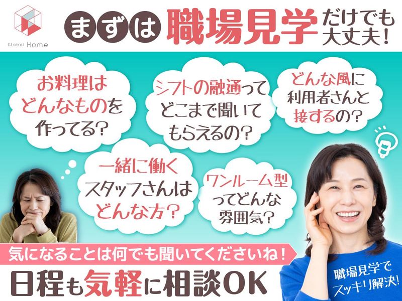 仕事内容 ⭐家事そのまま!業界未経験者大歓迎!☕ ✨日中だけで無理なく両立✨ ◆「子育ても落ち着いたし、 朝から午前中の少しだけ働きたい」 ◆「初めての業界だけどやりがいを感じたい」 そんな主婦(夫)の方にピッタリ♪ ☘1Rごとのお部屋で利用者さんと程よい距離感✋ 障がい区分も軽めの方が多く、 ➰未経験でも安心して始められます☘ ✨お任せすることはとってもシンプル! ✅カレーや煮物などレシピサイトを 見ながら簡単な家庭料理づくり◎ ✅お部屋の掃除や洗濯など、 軽い家事全般◎ ✅「今日はどうだった?」 「困ってることない?」などの 会話や見守りをするだけでOK! <特別な資格や経験は一切不要!> ご自分のペースで、家事をしながら 人と関わる、心がほっとあたたかくなる お仕事です◎ 障がいをお持ちの利用者さんが 生活をしているワンルーム型の グループホームで日常生活の ちょっとしたお手伝いになります! ☘未経験の方も大歓迎!☘ 職員同士のサポート体制もバッチリ! しっかりしていて、わからないことは すぐに相談できる環境です◎ ✨まずは職場見学からもOK!✨ 「どんな人が住んでいるの?」 「どんな雰囲気?」など、 働く前に実際の様子をご覧いただけます ので安心してスタートできます♪ ✨夜勤なし・日勤のみで無理なく 働けます!✨ 【グローバルホームとは?】 軽度障がい者向けのマンション型 グループホームなので夜勤はありません。 週2日~、1日4~5時間程度で、 普段の家事の延長で働けちゃいます♪ 子育てが落ち着いたから久々に 仕事を始めたそんな30代・40代・ 50代・60代の中高年・シニア層も活躍中。 研修制度もしっかりしていますし、 手当等も充実しているので 安心して始められる環境です◎