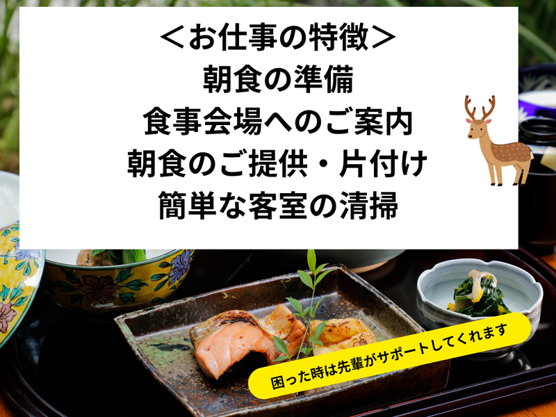 仕事内容 ■1日のお仕事内容 主に個室食事処などでの会席料理を丁寧にご提供するお仕事です 〇朝食の準備 ◯食事会場のご案内 〇お客様へ朝食をご提供 〇簡単な客室の清掃 レストランスタッフは、ご滞在中のお客様と一番話が出来るシーンが多く、非常に見識が高まるお仕事です。 また、このポジションは対話を楽しめる方で、かつ人の気持ちを察することに長けた方に向いたお仕事です。 レストランやカフェでの接客経験のる方なら慣れも早いでしょう。 こちらの仕事は常にチームワークですので、常に仲間と協力しながらミッションを成し遂げることが好きな方にも向いています。