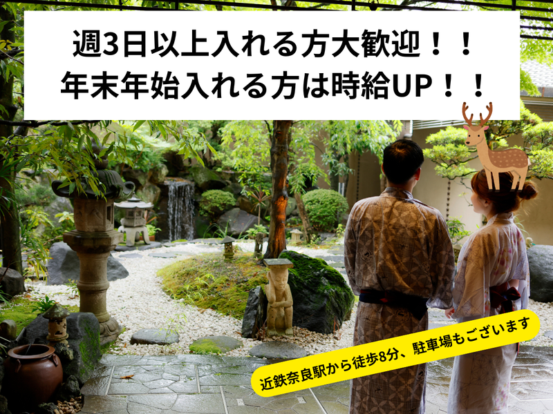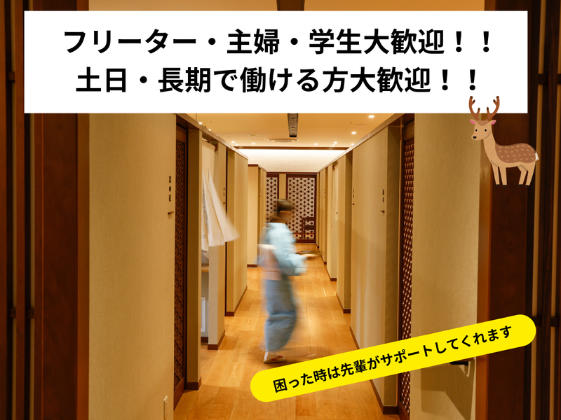 求めている人材 ・飲食店やアパレルなどの接客業での経験を活かしたい方 ・旅館・ホテルでの就業経験をお持ちの方 ・4時間ほどのパートタイムで働きたい方 ・子育てなどでフルタイムは難しいがパートで働きたい方 ・「人を好きな人」「人を笑わせることが出来る人」「人のために何かをするのが好きな人」 ・ホテル・旅館での就業経験はないが、おもてなし業には興味がある方 ・外国語のスキルを活かしたい方(日常会話程度で充分です) ・日本料理や器をはじめ日本の文化に興味をお持ちの方 ※補足※ ・未経験OK ・学生、主婦、フリーター歓迎 ・経験者歓迎(ブランクOK) ・ハローワークでお仕事お探し中の方も大歓迎 性別の条件と理由:女性歓迎(ポジティブアクション)