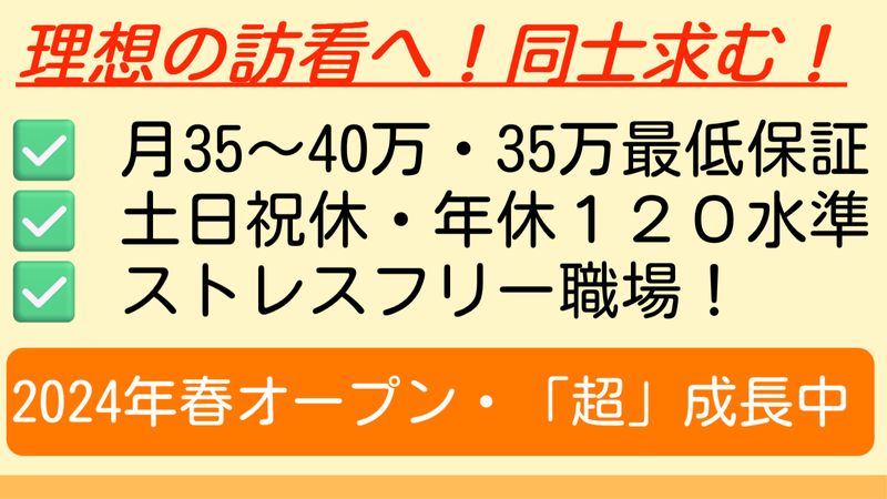 仕事の内容 ・給料が安すぎる・・ ・土日祝は、休みたい! ・経営者が現場をほったらかしにしている ・経営者が現場をわかっていないので、ストレスフル ・ステーションの人数が少ないから、業務が負担すぎる・・ ・京都の地域医療に貢献したい! ー もし、これらの中に1つでも該当することがあって、「今の職場のままじゃ、むくわれない・・」という気持ちがあれば、ご安心ください。 おおげさかもしれませんが、たくさんある求人の中から、このページにアクセスしたことが、あなたの「人生のターニングポイント」になるかもしれません。 逆に言うと、「このまま、貴重な時間を、今の職場で消費しつづける」という選択は、「あなたの1度きりの看護師人生」にとって、もったいない事なのかもしれません。 ー はじめまして! 株式会社田中電機の田中と申します。 私は、製造業を15年経営している経営者です。 この度、訪問看護事業にのりだすこととしました。 こう言うと、「なんで、電気屋さんが訪問看護なの??」なんて思われるかもしれませんね。 この点、ちょっと説明をさせてください! 実は、5年程前、家内の父が病気になり、診断結果は「癌」でした。 ステージ3で、直ぐに入院。 幸い、手術も成功し、退院するまで回復しました。 もっとも、その後も、入退院を繰り返すといった闘病生活となりました。 その時に、「訪問看護」と出会いました。 お恥ずかしながら、「訪問介護」は知っていたのですが、「訪問看護って何だ?」と知りませんでした。。 その時に、「訪問看護」に興味をもち、色々と調べる中で、「地域医療をすすめる国の方針」「病院の病床が足りない現状」「訪問看護が今後地域医療の担い手になっていくこと」等を知りました。 「訪問看護って大変な仕事だけど、これからの超高齢化社会では、在宅医療を支る大事な仕事だよなー」って強く感じました。 それと共に、 「医療関係者じゃなくても、訪問看護ステーションって開けるんだ!」 「自分の15年の経営経験を活かし、地域医療に貢献できるのではないか」 「我が家は、訪問看護にお世話になったからこそ、恩返しをしたいな」 こんな風に、思うようになりました。 これが、私が「訪問看護はじめたいな!」って思ったきっかけです。 ちなみに、現在、義父は、訪問看護の看護師さんにケアしてもらいながら、闘病生活をしています。 義父の体調面や精神面のケアはもちろん、「家族である義母」の事も、親身になってケアしてくれています。 おかげで、義父も義母も、「住み慣れた我が家」で、安心して暮らせています。 こういった環境を訪看さんに作ってもらったがおかげで、「家内」も、安心して生活ができるようになりました。 ホント、訪問看護師さんの存在は大きく、感謝しかありません。 こういった経験をしてきたからこそ、 「お世話になった訪問看護を支えたい!」 「少子高齢化で訪問看護が足りなくなってくる課題があるので、微力ながら経営経験を活かして、貢献したい!」 「どうせやるなら、働いてくれている看護師さんの待遇を改善し、ケアに集中できる環境を作りたい!」 といった思いを胸に、訪問看護ステーションを開所することとしました。 こういった僕の思いに共感していただける方と、「京都市山科区の在宅医療」を支えていきたいと考えています。 ー それでは、なぜ、「弊社なら、あなたの人生のターニングポイントになれるのか」について、1つ1つ理由を説明させていただきますね! ちなみに、弊社は「『求職者さんの人生の選択』がかかわっているからこそ、徹底的に情報開示する」というスタンスです。 だって、そうしないと「こんなはずじゃなかった・・」とお互い不幸になりますからね。 ですので、こちらの求人も、ゆっくり・じっくりお読みいただければと思います! ー 【35万円保証】 月給は、35万円保証。 これは、京都市の水準で言うと、高い方だと思います。 なぜなら、「看護師としてのあなたの専門性、資格や経験」を評価し、「その評価に見合った金額をお支払いしたい!」と考えているから。 なので、「月給35万〜月給40万」という形で、求人をさせていただきました。 ー 【土日祝休・年休120日水準】 弊社は、「休むときは休み、仕事は一生懸命やる」という考え方。 なので、土日祝日休み、としています。 これは、 「看護師さん、療法士さんは大変な仕事だ」 「大変な仕事だからこそ、休みは確保したい」 「ケアする人が元気でないと、良いケアはできない」 このように、考えているからです。 ですので、訪問看護業界的には、「休みが多い水準」の設定をしています! ー 【15年の経営経験】 訪問看護ステーションって、「100個できて40個つぶれる」といった感じなんですよね。残念ながら。 でも、少子高齢化なので、需要がないわけじゃない。むしろ、増えてる。 結局、「支援が必要な人に、うまく巡り合えてない(営業がうまくいってない)」といった感じなん
