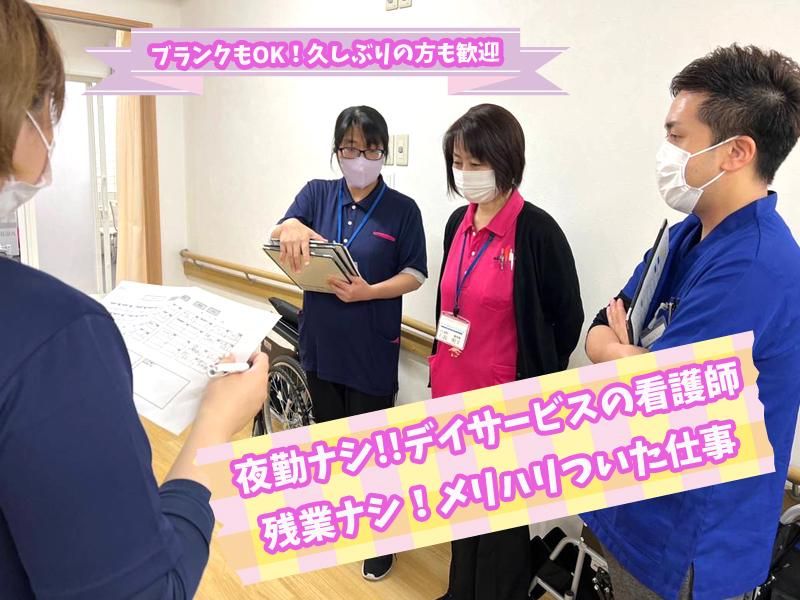 仕事内容 / 時給1700円~/週1日~OK 17時退社✨残業・夜勤ナシ デイサービスの看護師 \ ✅「要支援~要介護2」の軽度な方ばかり ✅医療行為なし ✅入浴介助・オムツ交換なし あなたには、施設看護師として活躍頂きたいと考えています。 おしゃべりが好きな方は大歓迎!!ご利用者様と楽しんでどんどん会話して下さい! <1日の流れ> 午前:バイタル・処置・服薬管理 午後:簡単なデータ入力・記録・準備 17時退社で残業なし◎ ※看護師さんは常時1名体制なので、介護スタッフとの連携して業務を進めます。 しっかりサポートしますので久しぶりの方や経験が浅い方も安心!! ✅おススメポイント …………………………… ⭐年齢不問/60代~活躍中 ブランクが長い方も安心!!子育てが落ち着いたから…とスタートした方も多数活躍しています。 スタッフ同士のコミュニケーションも活発で、楽しく働いていただけると思います。 ⭐週1日~OK 扶養内もWワークもOK!!あなたの希望の働き方をご相談ください。 【新しいカタチのデイサービス】 salon&sports(サロスポ)ではじめよう!! 「従来型デイサービス」+「機能訓練型デイサービス」の良い所を合わせたデイサービスを総称してハイブリッド型デイサービスといいます。デイサービスは全国に約3万店舗以上ありますが、ハイブリッド型デイサービスは弊社が運営する「サロンアンドスポーツ」のみになります。当グループは、全国の介護施設の運営コンサルタントの経験があり、ご利用者様の声から生まれた理想の形のデイサービスです。 一人ひとりの前向きな意見が反映されやすく、「働きやすい職場」を自分たちで築けることが魅力です! ――――――――――― サロン&スポーツ https://salosupo-saiyo.com/