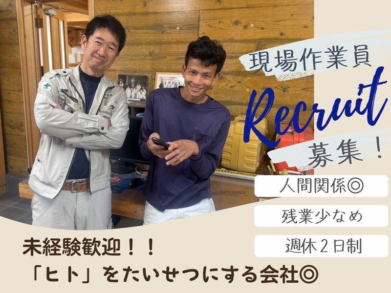 仕事内容 《未経験OK/週休2日制&残業少なめ》 手に職つけて長期で活躍してみませんか☆ ✅ここで働く魅力  ̄ ̄ ̄ ̄ ̄ ̄ ̄ ̄ ̄ ̄ ̄ ̄ ̄ ̄ ̄ ̄ ̄ ̄ ̄ ̄ ・残業少なめ&長期休暇も充実! ・事務所がきれいで気持ちよく働ける♪ ・30代~40代の若手が多く、社長も含めて みんな気さくで話しやすいので 分からないことも気軽に聞きやすい◎ ✅具体的な仕事内容  ̄ ̄ ̄ ̄ ̄ ̄ ̄ ̄ ̄ ̄ ̄ ̄ ̄ ̄ ̄ ̄ ̄ ̄ ̄ ̄ <公共工事や民間工事の現場での現場作業> ◇公共工事(国や自治体から依頼される 河川や道路、下水道等) ◇民間工事(企業から依頼される 宅地造成や外構等) ✅入社後のキャリアアップイメージ  ̄ ̄ ̄ ̄ ̄ ̄ ̄ ̄ ̄ ̄ ̄ ̄ ̄ ̄ ̄ ̄ ̄ ̄ ̄ ̄ ※未経験者の場合※ ⭐入社~入社1年 経験がなくても最初は簡単な作業から お任せするのでご安心ください♪ ・水と砂とセメントを混ぜる作業 ・ブロックを運び積み上げる作業 ・資材などの積み下ろし ・重機・建設機械の補助作業 など おっとり社長をはじめ馴染みやすいスタッフ が多いので安心してくださいね♪ ⭐入社2年~5年 興味があれば、協力業者の方の仕事の手伝い や新人教育など、現場のリーダーポジション のサポート業務を担っていただくことも◎ また、この業界で役に立つ資格取得をしたい という人は会社の支援制度を利用して 資格取得も可能です!! ⭐入社年5年~8年 一通り作業が出来るようになったら 現場の管理業務のサポートをお任せ。 ここまでくれば業界からも重宝される 人材となり、給与も跳ね上がります! ✅1日のスケジュール  ̄ ̄ ̄ ̄ ̄ ̄ ̄ ̄ ̄ ̄ ̄ ̄ ̄ ̄ ̄ ̄ ̄ ̄ ̄ ̄ 08:00 朝礼・各現場へ (現場:久留米市内及び近郊) 10:00 休憩(30分) 12:00 昼休憩(60分) 13:00 作業再開 15:00 休憩(30分) 17:00 作業終了・帰社(作業報告) ====================