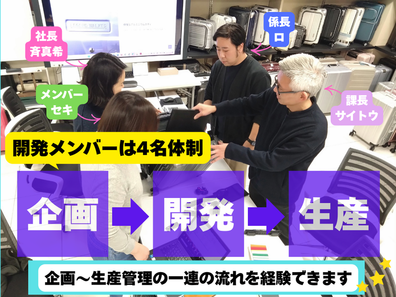 仕事内容 < ここがポイント > ◆中国工場との連携を通じて、 あなたのアイデアを“商品”として世に送り出せる仕事です。 ◆スーツケースブランド「LEGEND WALKER」やOEM商品など、 幅広いアイテムの企画・開発に携わります。 中国の工場と日常的にやり取りを行い、 現地との橋渡し役として重要なポジションを担っていただきます。 「日本企業での仕事経験を活かしたい」 「モノづくりに深く関わりたい」 「将来は企画・開発の中核を担いたい」 そんな方に最適な環境です。 現場と密にコミュニケーションを取りながら、 商品開発の最前線をリアルに経験できます。 また、担当部署には 入社2年でマネージャーに昇進した実績もあり、 スキル・実力次第で早期キャリアアップが可能です。 < 会社紹介 > 当社は、スーツケース・トラベルグッズブランド 「LEGEND WALKER」 を中心に、 ペットと旅する「PETiCO」、 ライフスタイル雑貨まで幅広く展開しています。 単なる製造ではなく、 お客様の「旅体験」をより良くすることを目指し、 企画・品質・使いやすさに徹底的にこだわっています。 < 応募資格 > 必須条件 ・ 日本企業での勤務経験がある方 ・ 中国語(ネイティブレベル) ・ 日本語での業務コミュニケーションが可能な方 ・ 普通自動車免許(AT限定可) 歓迎条件 ・ 商品開発、生産管理、品質管理いずれかの経験 ・ 中国工場との折衝・調整業務経験 ・ 日本と中国のビジネス文化の違いを理解している方 < 求人内容 > 入社翌年以降、半年に1回程度 中国出張の可能性あり。 中国工場と直接やり取りを行いながら、 企画~量産・出荷までを一貫してサポートしていただきます。 ■ 主な業務内容 ・ スーツケースブランド「LEGEND WALKER」およびOEM商品の企画・開発 ・ 中国工場との生産調整、納期・品質管理 ・ 発注~出荷までの進捗管理 ・ 仕様書・指示書の作成、サンプル確認・改善指示 ・ 工場との技術・仕様面での調整 ・ 営業・デザイン・物流部門との連携 ■ この仕事の魅力 ✅ 中国語×日本企業経験を最大限に活かせる ✅ 未経験分野でも先輩社員が丁寧にサポート ✅ 会社の中核を担う部署で、評価・昇進スピードが早い ✅ 自分が関わった商品が、日本・世界で販売されるやりがい ■ ご応募お待ちしています あなたの経験と語学力を活かし、 次のヒット商品を一緒に生み出しませんか? 日本で長くキャリアを築きたい方、 商品開発の中心で活躍したい方のご応募をお待ちしています。