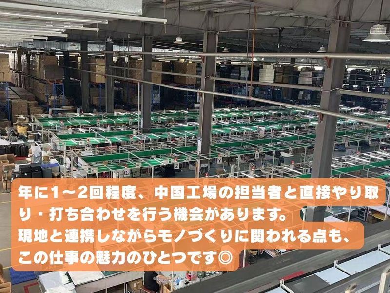 求めている人材 【必須スキル】 ・普通自動車免許(AT限定可) ・中国語(ビジネスレベル/読み書き・会話) ・基本的なPCスキル(Excel・Word・メール対応) ・社内外との調整やコミュニケーションに抵抗がない方 【歓迎スキル】 ・海外工場との生産管理または品質管理の経験 ・社内外の納期調整・進捗管理の実務経験 【歓迎するご経験】 ・営業 ・貿易事務/輸出入管理 ・生産管理/購買管理 ・商品企画・商品開発 ・品質管理/品質保証 ・プロジェクトコーディネーター ・工程改善(IE) など 「語学力 × 調整力 × ものづくり」のご経験をお持ちの方は、 即戦力としてご活躍いただけるポジションです。 また、経験の有無にかかわらず、 ものづくりに関わりたいという意欲を何より重視しています。 これまでのご経験と、これから挑戦したいことを、ぜひお聞かせください。