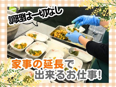 仕事内容 / 夕方までに退勤!( *´v`*) \ ▼△▼△▼△▼△▼△▼△▼△▼ ■家事の延長でできるお仕事 ■調理・接客ありません! ■シフトは柔軟対応! ■面接時、履歴書不要! - - - - - - - - - - - - - - - - - - 電話応募・お問合せもOK! TEL:06-4302-3971 ▼△▼△▼△▼△▼△▼△▼△▼ 【仕事内容】 おとしよりすこやかセンター東部館で ■料理を盛り付ける ■料理をミキサー等で細かくする ■トレイにお皿を並べる ■食後の食器を洗う といった調理補助をお任せ! ┏ ━━━━━━━━━━━━━ ┓ お昼休憩にはまかない有(・v・)/ 1食250円で食べられる 栄養満点にまかないあり! お弁当分の荷物を減らせて 通勤もラクラク◎ ┗ ━━━━━━━━━━━━━ ┛ ───────────── ★ 未経験歓迎です! ★ ───────────── 調理や接客はありません! 普段の家事の延長でできる とてもシンプルなお仕事です! コツコツモクモク集中してたら もう退勤の時間!なんてことも! 食器はプラスチック製なので 軽くて扱いやすく 割れる心配もありません♪ 食洗器があるので洗浄も ラクラク行えます◎ ───────────── ★ 和やかな職場です ★ ───────────── 30代40代50代60代の 主婦パートさんが活躍中! 「これやっておくね~!」 と声を掛け合いながら 助け合って働いています◎ 分からないことがあれば 先輩がしっかりフォロー! まずは固定のポジションで 少しずつ慣れていきましょう♪ ───────────── ★こんなお料理をご提供★ ───────────── <献立例> ■鶏肉の味噌漬け焼 ■大根の煮物 和風サラダ ■すまし汁 ■白ごはん 出来るだけ手作りにこだわった 栄養満点の美味しい献立です! Aさんにはペースト状 Bさんには細かく刻んで と健康状態に合わせた形状で ご提供しています! 「これ今度うちで作ろうかな♪」 なんて料理のレパートリーの ヒントになるかも! :::::::::::::::::::::::::::: 電話応募・お問合せもOK! TEL:06-4302-3971 ::::::::::::::::::::::::::::