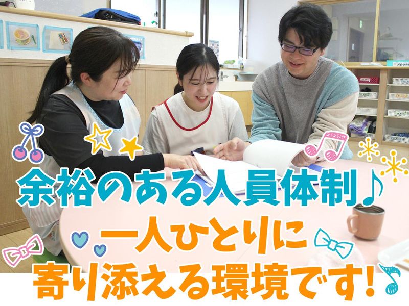 仕事内容 / お子さん10名に スタッフは5名の万全な体制! 余裕をもってゆったり 子ども達と過ごしませんか? \ 【☆★定着率バツグン!★☆】 基準以上の人員配置で、 子ども1人ひとりに手厚いサポートが可能。 スタッフの負担も少ないのが特徴です。 [残業なし]はもちろん、 持ち帰りの仕事もなく、[完全週休2日制] [年間休日120日]と休みもたっぷり。 有休も取りやすく、プライベートの時間を 大切にできる環境です! 【☆★温かい人間関係!★☆】 子どもはもちろん、スタッフの悪口はNG。 そんな雰囲気を魅力に感じてくれている 温かい方が活躍しています。 だから、あなたもきっとすぐに 馴染んでいただけると思います。 長期で活躍している方が多いので、 今回も久しぶりの募集です。 まずは職場見学だけでもOKですので、 施設の雰囲気を感じてみてください♪ 【☆★子どもにとっての第3の居場所★☆】 子ども達にとって、家と学校との間の ワンクッションとして楽しんでもらえる 居場所づくりを目指しています。 ですから、子ども達が安心して過ごせるよう 一人ひとりの気持ちに寄り添った 支援を行っています。 ぜひ一緒に子ども達と 楽しい毎日を過ごしていきませんか。 - 【具体的な仕事内容】 子ども達の日常生活や社会への適応に向けたサポートをお任せします。 日々の活動はおにごっこやリズム遊び、制作、本など… 季節によっては、買い物をしたり、 バスに乗って遠出をしたりすることも。 さまざまな遊びを通して、楽しみながら 生きていくうえで大切なスキルを身に付ける お手伝いをします。 療育カリキュラムは1ヶ月毎に作成。 大体の枠組みは年度ごとに決めているので あとは担当児童に合わせて微調整するだけ。 児童にとって思い出に残る毎日を作り上げましょう。 【入社後の流れ】 最初は先輩が常にそばについてサポートします! 慣れてからも、1人きりになることはありません。 温和で優しいスタッフばかりなので、 困ったことがあれば、気軽に相談・質問してくださいね。 定期的にケース会議も行っていますよ。 【当施設で大切にしていること】 子ども達は、日常生活において 難しい課題が多くあります。 そこで私たちは、スモールステップで 子ども達ができることを増やす 支援を目指しています。 たとえば、砂遊びでしか リラックスできない子どもに 室内でもできる遊びを見つけるなど、 できることを見つけられたときは、 やりがいを感じられる瞬間です。 - ・勤務先はご相談のうえ、 下記いずれかの事業所にて決定いたします ・将来的に、引っ越しを伴わない範囲で 異動の可能性あり ◆児童発達支援事業所 ゆうむ 神戸市灘区灘北通3-3-12 ◆児童デイサービス どりーむ 神戸市灘区灘北通3-3-12 ◆児童デイサービス あゆむ 神戸市東灘区御影塚町2-11-4 -