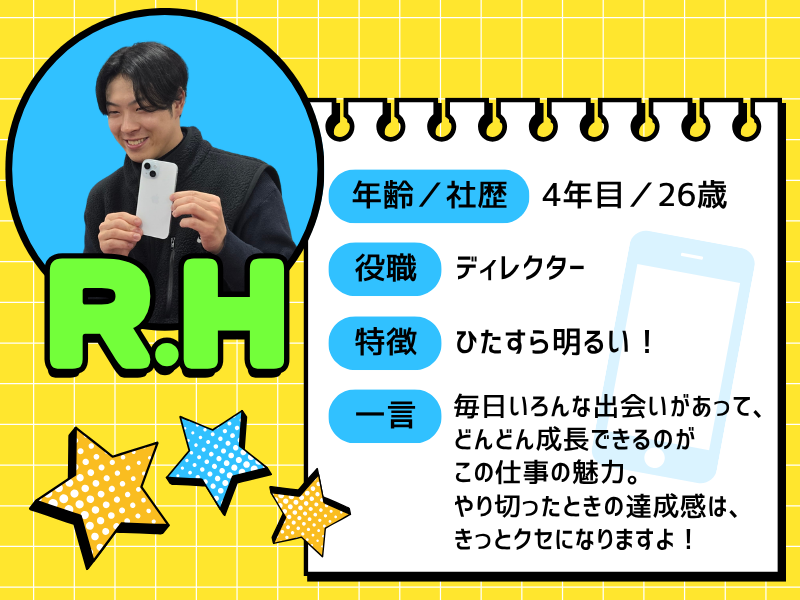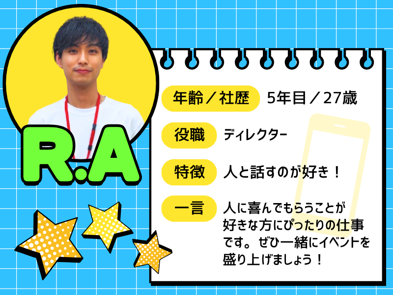 仕事内容 イベントの仕事って 「どんな仕事をするの?」 「職場の雰囲気って実際どう?」 そんな疑問に、現場で活躍する 2人のイベントスタッフが答えます! ∴☆∵‥∴‥∵‥∴☆∴‥∵‥☆∴‥ ⭐ 2人をご紹介!  ̄V ̄ ̄ ̄ ̄ ̄ ̄ ̄ ̄ 【R.A】 ディレクターをしているR.Aです。 お客様と楽しく会話しながら、 料金の見直しやお得な提案で 喜んでいただけることに やりがいを感じています! 【R.H】 同じくディレクターのR.Hです! 明るさが強みで、大きな リアクションとポジティブさで、 現場を明るくしています! ∴☆∵‥∴‥∵‥∴☆∴‥∵‥☆∴‥ ⭐ どんな仕事?  ̄V ̄ ̄ ̄ ̄ ̄ ̄ ̄ 【R.A】 僕たちの仕事は、ショッピングモールや 商業施設などのイベント会場での 声かけ・集客などがメイン。 抽選会やビンゴなどを通してイベントを 楽しんでもらっています! 【R.H】 「イベント運営って難しそう」と 思われることもあるんですが、 お客様とお話するのがメインで、 案内する商材も限られているから すごく楽しくて簡単なんです! 契約や書類とか…難しいことは 本部のスタッフが対応してくれるから まずはお客さんと楽しく会話できれば 全然OKですよ! ⭐ どんな職場?  ̄V ̄ ̄ ̄ ̄ ̄ ̄ ̄ 【R.A】 若手メンバー中心の明るい職場で、 みんなで協力して楽しく働いています! 仕事中はもちろん、BBQをしたり 旅行したりとプライベートでも 仲良いのが自慢です◎ 【R.H】 イベントを成功させるためにみんなで 意見を出し合いながら進めているので、 チームの一体感も抜群です! さらに、会場が定期的に変わるため、 毎回新鮮な気持ちで働けるところも 僕は好きですね♪ 【R.A】 本当に、現場は明るい雰囲気ですね。 スタッフ同士の会話も多くて、 困った時も相談しやすいです。 楽しく働きながら、ちゃんと チームで頑張れる環境だと思います! ⭐ 特に得意・楽しいのは?  ̄V ̄ ̄ ̄ ̄ ̄ ̄ ̄ ̄ ̄ ̄ ̄ ̄ 【R.H】 僕が得意なのはキャッチ! 最初は正直、知らない人に話かけることに 抵抗感とか怖いなって気持ちがありました。 でも、沢山の人と関わる中で 「色んな人がいるんだな」とか 「この人面白い!」っていう 他の仕事ではあまり無いような 発見があって楽しいです! お客様に信頼してもらって、 成約をしていただいた時は 本当に嬉しくて達成感も大きいです◎ 【R.A】 景品選びやPOP、装飾を考えるのが得意で、 いかに「お客様に楽しんでもらえるか」 を意識しながら日々工夫しています! ⭐ この求人を見ている方に一言!  ̄V ̄ ̄ ̄ ̄ ̄ ̄ ̄ ̄ ̄ ̄ ̄ ̄ ̄ ̄ ̄ 【R.A】 仕事が楽しいはもちろん、頑張りは インセンティブなどでしっかり評価される 環境なので、やりがいを持って働けます! 年間休日130日以上と休みも多く、 ワークライフバランスも大切にしたい という方にもぴったりだと思います。 人と話すことが好きな方、 喜んでもらうことにやりがいを 感じる方は、ぜひ一緒に 楽しみながらイベントを 盛り上げていきましょう! 【R.H】 「人と話すことが好き」 「楽しい空間をつくりたい」 という気持ちがあれば大丈夫! 未経験でも輝ける仕事です。 笑顔と元気でお客様との距離も 縮まっていきますよ◎ 毎日いろいろな出会いがあり、 自分自身の成長も実感できるのが この仕事の魅力。 「やってみたい」の気持ちがあればOK! 仲間と一緒にイベントを盛り上げ、 達成感を味わえる環境で、 新しい一歩を踏み出してみませんか?