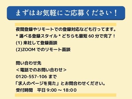選考プロセス 夜間登録やリモートでの登録対応なども行ってます。 *選べる登録スタイル* (1)来社して登録面談 (2)ZOOMでのリモート面談 【問合せ先について】 問合せ先:0120-557-106 <電話でのお問い合わせ> 0120-557-106 まで「求人のページを見た」とお問合わせください。 受付時間 平日9:00~18:00 応募方法 まずはお気軽にご応募ください! メールアドレスをお知らせいただければ、当社よりご案内をお送りします!