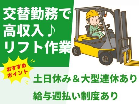 ★草津市×フォークリフトでの入出庫作業!商品の運搬・格納作業★リフト作業メイン◎2交替でしっかり稼げる!土日休み&長期休暇あり♪マイカー通勤OK!