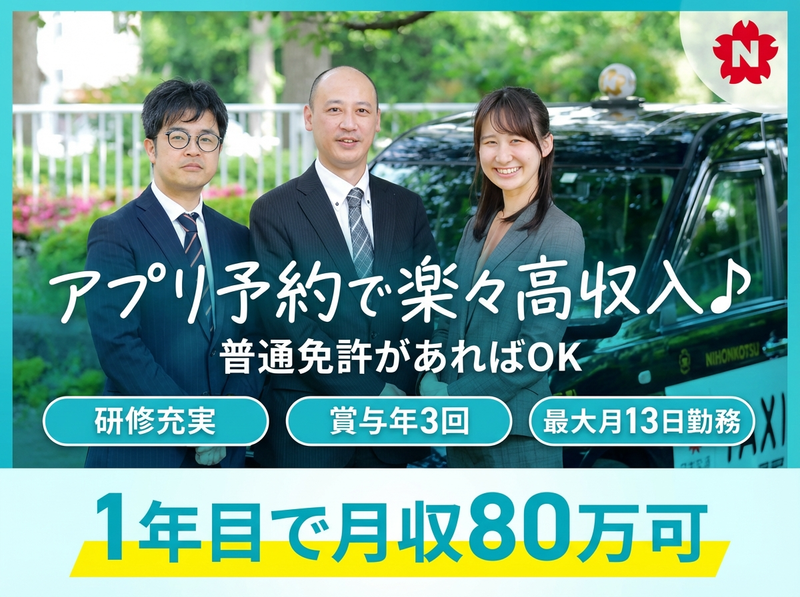 仕事内容 ―― スグ働きたい方応援! ―― ★1分で応募完了 ★職務経歴書や自己PR不要 ★電話応募受付中 ★60歳未満面接確約 ★面接交通費支給、車で来社可能 ―――――――――――――――― 飲食や接客、営業の経験者大歓迎♪ ・年収500万円⇒900万円 ・残業月60時間⇒月5時間 ・月あたり休日2~3日UP など好条件を実現した先輩が多数! 【コミュニケーションスキル】や 【相手の目線に立って考える力】が ダイレクトに活かせるドライバー職で、 高収入とプライベートを両立しませんか? ――――――――――――――- 《 シンプル3step 》 (1)アプリで予約が入ると (2)お客さまの位置情報が来るので (3)その場所に車を走らせ、 お客さまをピックアップ! 目的地まで送り届けます♪ シンプル3stepでも高収入! 40代・50代が稼いでいる シンプルな送迎業務です!! ―――――――――――――――― 《 主な業務 》 配車専用アプリ「GO」などで ご予約いただいたお客さまのもとへ伺い、 指定の場所まで送迎を行います。 ▼入社後は… 国内トップクラスの評価を誇る 日本交通グループの研修を行います! ドライバーに必要不可欠な地理研修から、 接客・運転テクニックを学べる 研修制度まで幅広い知識を学べます。 ▼その後は… タクシー乗務員資格取得を目指します。 もちろん取得費用は全額会社負担です! 取得&デビュー後も継続して支援! 先輩スタッフとの同乗を始め、 徐々に現場に慣れていけます。 また、業務に慣れるために 入社後1年間は通常ドライバーとして 自分のペースで車を走らせます♪ ―――――――――――――――― 《 圧倒的高収入! 》 日本交通グループなら 初年度平均年収は570万円です! しかも流しなしの予約専門で これだけの収入を得られるので、 一般的なドライバーよりも 圧倒的に稼ぎやすいのが特徴です。 ▼しかも! 過去最高の1000万予約数を突破するなど 配車アプリは予約殺到中のサービス♪ 毎月安定して稼げるのが特徴です。 ―――――――――――――――― 《 先輩たちの特徴 》 40代、50代からの転職者が多数! 飲食業、サービス業、接客販売職、 不動産営業などの経験者が多くいて、 年収アップを実現しています。 【ノルマなし】【残業なし可】 【客引き・新規開拓なし】なので、 「のびのび働けている」という声も。 人と接する機会が多い仕事なので、 コミュニケーションが好きという方は 特に活躍できるポジションです♪ ―――――――――――――――― 《 働き方は自由です! 》 「どんどん稼ぎたい!」という方は ある程度時間外も加味した働き方を、 「プライベート優先!」という方は 残業なしの働き方をお選びいただけます! ▼ちなみに… 「来月は出費が多そうだな」 となったらその月はがっつり働いて 『月収80万円』を目指す… なんて働き方もできます! ―――――――――――――――― 《 業界屈指のサポート体制! 》 業界トップクラスの日本交通グループは、 未経験者向けのサポート体制が充実です。 【基本的な知識や業務の流れ】 【地理研修や運転テクニック】 【車内設備の種類や使い方】 【接客の際のコツやポイント】 【気を付けた方が良い点】まで イチから指導してくれるので安心です。 圧倒的な従業員規模とノウハウがあり、 もしトラブルが発生した際は 迅速に内勤スタッフがサポート。 業界随一のバックアップ体制です! ―――――――――――――――― 《 快適な車内で働けます! 》 冬は暖房、夏は冷房で、 いつでも快適な車内環境で働けます。 降車するタイミングも比較的少なく、 一般的なドライバー職よりも 力仕事の機会もないため、 性別に関係なく働きやすい仕事です!