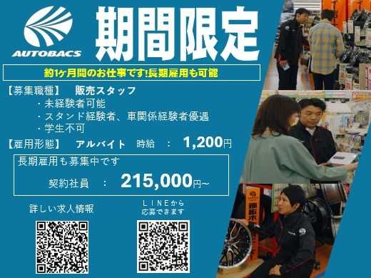 仕事内容 業務拡大|【期間限定】店内販売・接客スタッフ|パート・アルバイト|オートバックス石狩花川 幅広い年齢層が活躍中!経験も年齢も不問です! コマーシャルでもお馴染みの「オ~トバックス♪」で 接客、店内販売業務をお願い致します! \未経験OK!先輩スタッフがサポートします!/ 接客ノウハウやクルマに関する知識、作業の基本は 入社後に先輩スタッフが優しく丁寧に指導します。 お客様に商品の説明を行ったり、質問にお答えしたりする業務です。 その他の接客業務もお願い致します。 お客様とコミュニケーションをとり、企業の顔となるとても大切なポジションです。 最初はわからないのが当たり前ですので、スタッフ全員があなたを全力でサポートします! 未経験でも安心して勤務して頂けます! <接客>お客様からの質問への応対、商品の仕様や使用方法説明、など <店内販売>レジ応対、商品ディスプレイ整理、売り場づくり、など ※スキルアップにより昇給も可能です。正社員登用の実績も多数! アピールポイント <約1か月間の短期アルバイト> 長く働きたい方はご相談ください 就活中の方も就業体験とし働いてみませんか? <安定の働きやすさ> ◆カー用品をお得に購入できる社員割引有り♪ ◆シニアも含め、幅広い年齢層が活躍中! 腰を据えて長く働きたい方、家庭と両立して仕事をしたい方、 ぜひ一緒にオートバックスで働きませんか♪ 皆さんと働けることをスタッフ一同、心より楽しみにしています! ___________________________________ 【LINEでの応募はこちらから!】 当社を友達追加をしていただくことで、「応募」となります。 その後トークルームで、どの求人(職種・店舗・雇用形態)をご覧になったかをお送りください。求人についての問い合わせも、LINEをご活用ください!