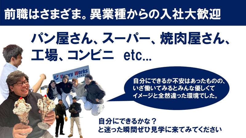 【保険制度】 雇用保険、労災保険、健康保険、厚生年金 待遇・福利厚生 【福利厚生】 ■車・バイク通勤可(駐車場完備) ■社用車貸与 ■作業服貸与 ■交通費支給(5km以上の場合) ■バイク通勤手当(5,000円/月) ■休業補償手当 ■安全手当 ■皆勤手当 (1年無遅刻無欠席で3万円支給) ■道具管理手当 ■企業型確定拠出型年金 ■資格取得支援制度 ※準中型免許など、業務で必要な資格は 入社後に会社が取得を支援 ■入社祝い金 (入社3カ月後に50,000円を支給) ■独立支援制度 ■再雇用制度 <ビクトリースマイルクラブ> 社員間のコミュニケーションを促進するために 会社がレジャー費用を負担する福利厚生です。 支給額は1人あたり50,000円! この半年間でサバイバルゲーム 、高級レストラン、 スノーボード旅行、誕生日パーティーなどを 企画・実施!