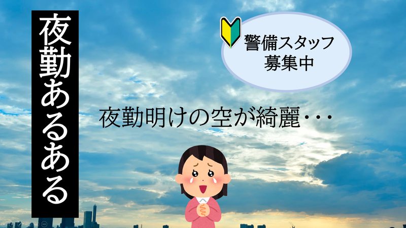 変形労働時間制 勤務時間詳細 実働時間:1日あたり3時間 〜 14時間 平均勤務日数:1ヶ月あたり1日 〜 25日 日勤/(例) 08:00~17:00 (実働3h~8h/休憩1時間) ※現場による ※残業があった場合は別途支給 夜勤/(例) 23:00~08:00(実働4h~8h/休憩1時間) ※現場による ※残業があった場合は別途支給 【一日のスケジュール例】 ~通し勤務の場合~ <日勤> ▼自宅から現場に直行 08:00 勤務開始 (一日の段取り確認→役割分担決め→担当箇所の周囲の確認→誘導開始) 12:00 お昼休憩 13:00 誘導業務 15:00 勤務終了 ▼自宅に直帰 <夜勤> ▼自宅から現場に直行 23:00 勤務開始 (一日の段取り確認→役割分担決め→担当箇所の周囲の確認→誘導開始) 25:00 休憩 26:00 誘導業務再開 27:00 小休憩 29:00 勤務終了 ▼自宅に直帰