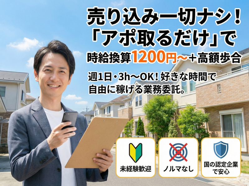 仕事内容 ✅未経験でも安心の時給保証あり ✅成約ではなくアポ取得がゴール ✅月収50万円以上も現実的 \営業未経験から高収入を実現/ ✨自分のペースで稼げる業務委託 【具体的な業務内容】 ✅ 担当エリアの戸建住宅を訪問 ✅ リフォームのご案内チラシ配布 ✅ 興味がある方へのアポ取得 入社直後は、お客様への ご案内(アポイント取得) のみに専念していただきます。 成約業務(クロージング)は 先輩社員が行うため、 専門知識は不要です。 【入社後の流れ】 最初は先輩が同行し、 ご案内のコツを丁寧に レクチャーします。 慣れてきたら、 ご自身の裁量で自由に 活動していただけます。 ■採用担当者からのメッセージ ✨稼ぎたい意欲がある方を応援 ✨素直に学べる方が活躍中 ✨将来的に独立も目指せます
