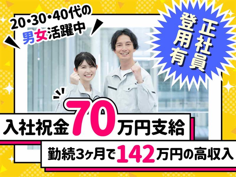 【保険制度】 雇用保険、労災保険、健康保険、厚生年金 待遇・福利厚生 【福利厚生】 ■入社祝金70万円! ひと月で5万円、3ヶ月で15万円と、 段階的に支給します(規定あり) ※詳細は面談時にご説明します ■社会保険完備 ■退職金制度 ■交通費規定支給(上限1万8600円) ■残業代全額支給 ■健康診断 ■制服貸与 ■車通勤OK(無料駐車場完備) ■社員食堂(カフェテリア形式) ■正社員登用制度(毎年10~20名程度) ※正社員登用後の賞与実績/5ヶ月分以上 ■友達紹介制度あり ※ご紹介者に20万円支給(規定) <各種手当も充実> ■時間外手当 ■皆勤手当(1万円) ■食事手当(2/3会社負担、1食約200円)