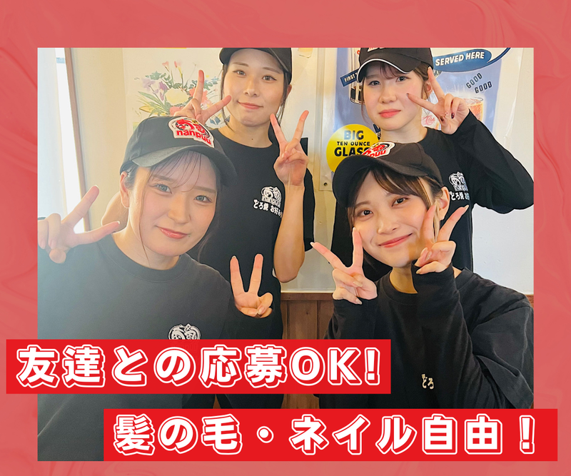 仕事内容 ✅この求人のおすすめポイント  ̄ ̄V ̄ ̄ ̄ ̄ ̄ ̄ ̄ ̄ ̄ ̄ ◎髪型・ネイル・ピアス自由! ◎高校生・大学生・主婦(夫) 初バイトの方も歓迎! ◎日祝は時給50円UP! ◎友達同士の応募もOK! ◎全商品20%OFFで食べれます! __________________ どろ焼が有名な喃風太子店での ホール・キッチンスタッフ! 高校生から大学生、主婦(夫)まで 幅広い年齢層のスタッフが活躍中です! 【具体的には】 ・席のご案内 ・オーダー取り ・料理の配膳 ・レジ対応 ・サイドメニューの調理 など 難しいことは本当にありません! 今働いているスタッフもほとんどが 飲食経験0や初バイトからのスタートです! 店長や先輩スタッフたちが優しく指導してくれます♪ 現在 高校生3名 大学生7名 主婦 3名 フリーター2名在籍してます 常連様も多く暖かい雰囲気のお店です! 一緒に助け合って楽しく働きましょう◎
