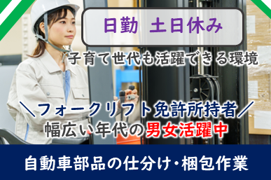 仕事内容 【フォークリフト作業】日勤のみ・土日休み!大型連休年3回!!18歳から49歳までの幅広い年齢層が活躍中!外国籍の方も活躍中!工場敷地内に無料の駐車場があります。 <仕事内容> 大手自動車メーカー関係のお仕事です。 フォークリフトでの作業となります。リーチかカウンターかどちらか一方の操作が出来れば大丈夫です。 車のオプション品などの仕分けや梱包作業をおこなっていただきます。 立ち作業・座り作業どちらもございます。 ≪職場環境≫ 男女活躍中の職場です。 休憩室完備 アピールポイント <仕事内容> 大手自動車メーカー関係のお仕事です。 フォークリフトでの作業となります。リーチかカウンターかどちらか一方の操作が出来れば大丈夫です。 車のオプション品などの仕分けや梱包作業をおこなっていただきます。 立ち作業・座り作業どちらもございます。 ≪職場環境≫ 男女活躍中の職場です。 休憩室完備 \充実した福利厚生/ ◎社会保険、雇用保険完備 ◎有給休暇有(6か月経過後10日付与)※規定有 ◎残業手当 ◎交通費支給(規定内) ◎確定拠出年金制度 ◎週払い制度(週3回対応) ◎お友達推薦制度あり(規定有り) ※1名につき3万円~10万円臨時給与として支給 ◎車(マイカー)・バイク通勤可(無料駐車場あり) ◎制服貸与 ◎食事持参可 ◎休憩室利用可 ◎福利厚生プログラム (宿泊、グルメ、ショッピングなど大幅割引が受けられる10万アイテムのメニューがあります。)