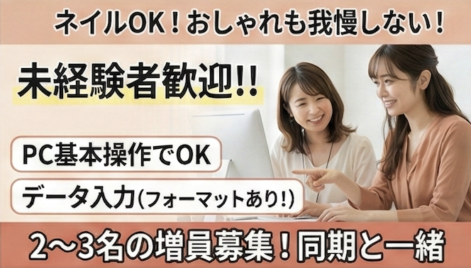 仕事内容 \オープニング募集!同期と一緒にスタート/ 扇町公園のすぐ隣、眺めの良いオフィスで 未経験から事務デビューしませんか? 時給1,500円スタートで待遇もバッチリです! <具体的にお任せするのは…> ・データ入力(フォーマットあり!) ・既存のお客様からのお電話対応 ・メール対応 ・その他、簡単な庶務業務 など 「事務って経験が必要?」 いいえ、そんなことはありません! 明るく丁寧に話すことができ、 PCの基本操作ができれば大丈夫です ============== ここがオススメ! ============== 【その1】未経験でも「高時給」 時給1,500円からのスタート! フルタイムで働けば月収23万円以上も可能。 安定した収入が毎月得られます。 【その2】プライベートも充実の「10時出社」 満員電車を避けてラクラク通勤♪ 朝活をしてから出社…なんてことも可能です。 残業もないので、平日夜も自分の時間に! 【その3】おしゃれも我慢しない! ネイルOK!髪型もオフィスカジュアルなら 自由です。仕事のために 自分のスタイルを変える必要はありません✨ ================ <職場環境> ・20代~30代の若手が中心の職場◎ ・「わからないことある?」と声を掛け合う風土 ・実際の雰囲気は面接時にぜひ感じ取ってみてください♪ 【雇用形態】 アルバイト・パート ※長期で安定して働きたい方歓迎 ※正社員登用実績あり 【アピールポイント】 /////////////////////////////////////////// ❶時給1500円~!しっかり稼げる◎ ❷土日祝休み&残業なしでオフも充実 ❸梅田・天満エリアでランチも楽しみ♪ ❹副業OK!Wワークも可能です ❺交通費は全額支給(上限15万円!) ///////////////////////////////////////////