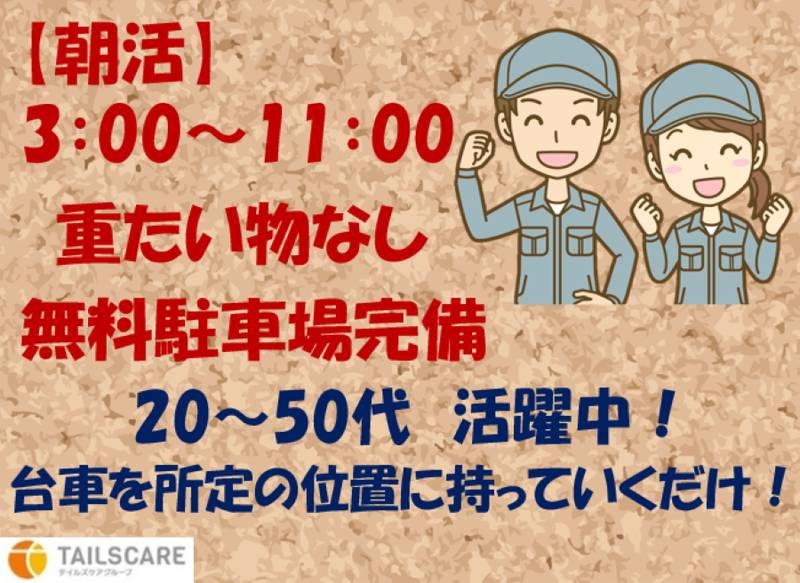 求めている人材 ・20代、30代、40代、50代 男女活躍中 ・週5日勤務が可能な方 ・体を動かす事が好きな方 ・早朝勤務を探されている方